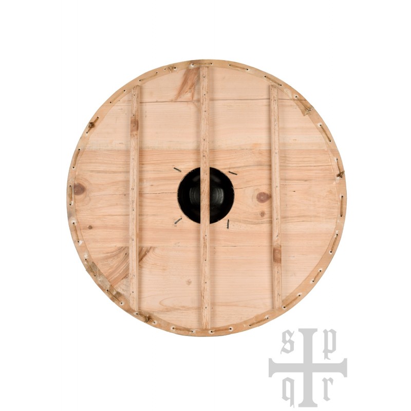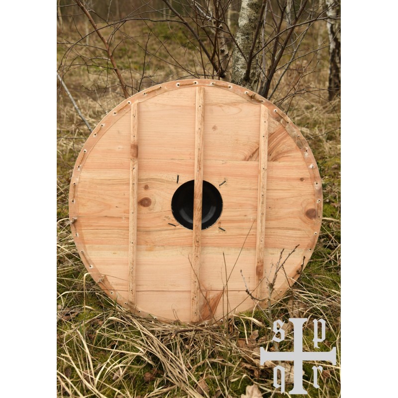 El amplio broquel de hierro no solo es funcional, sino que agrega un toque auténtico, asegurado firmemente por cuatro clavos. En la parte trasera, el escudo cuenta con tres listones de refuerzo de pino, siendo el central una empuñadura diseñada para un agarre cómodo.