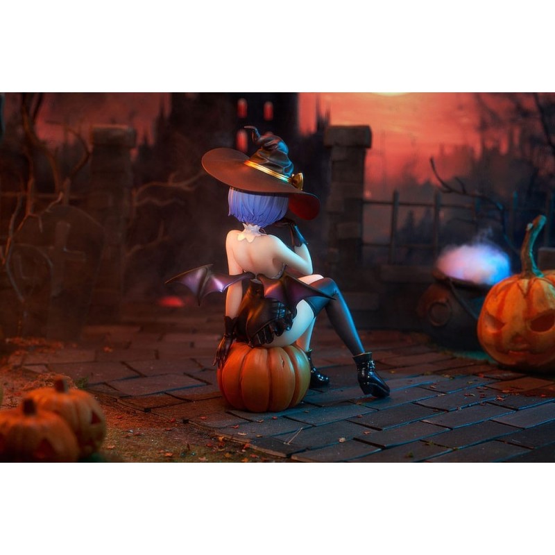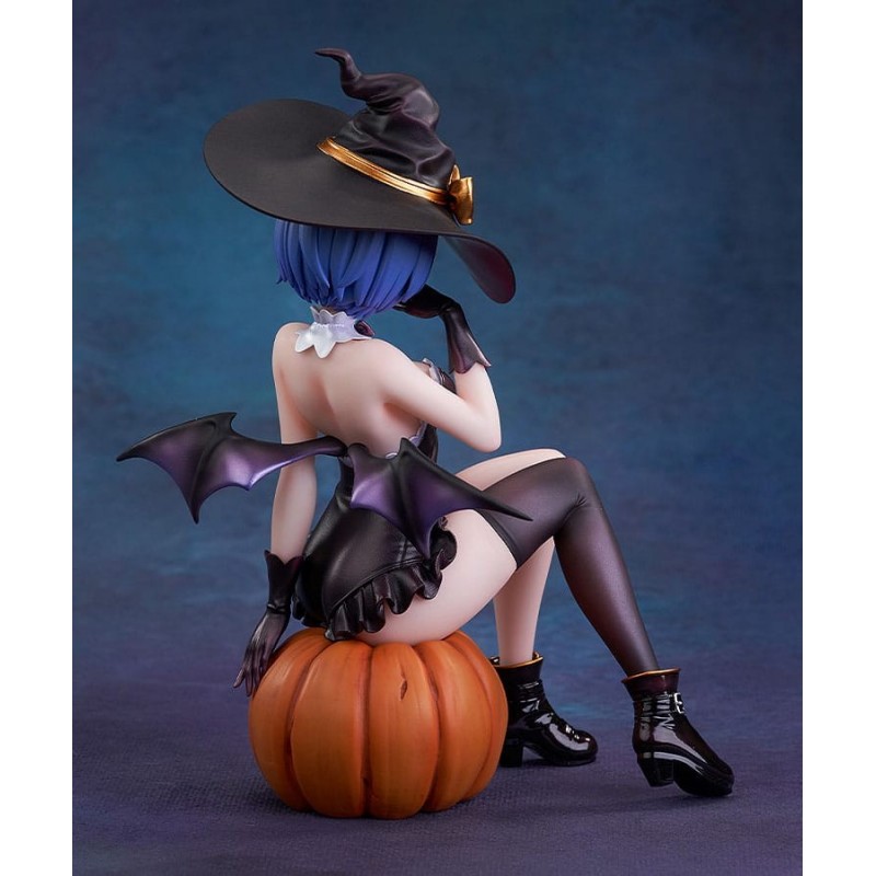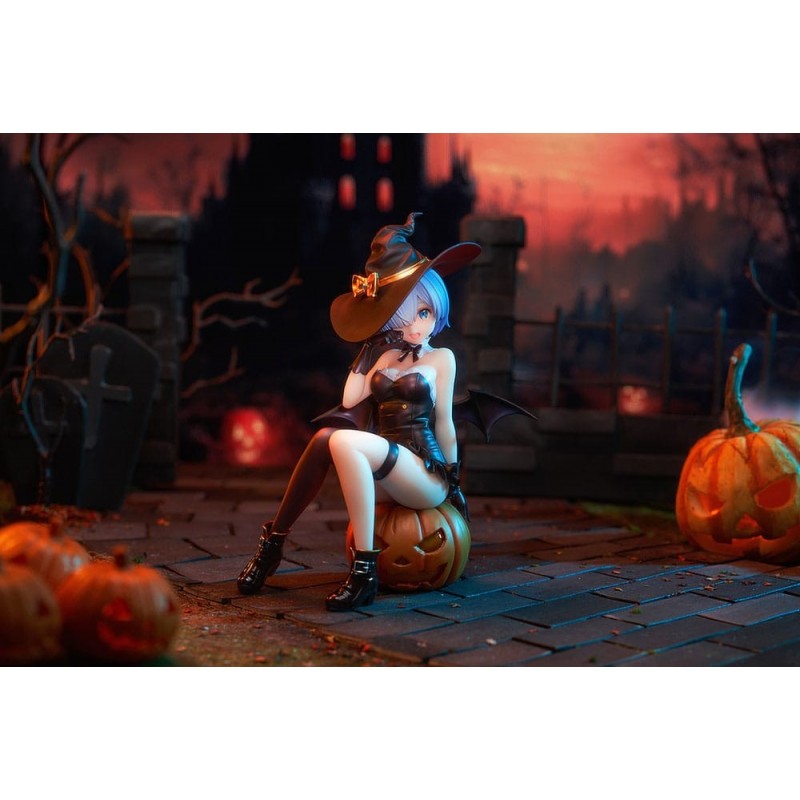 Realizada en PVC de alta calidad, la figura muestra a Rem sentada sobre una calabaza de Halloween, con detalles como las pequeñas alas que asoman por su espalda, guantes y botas negras que complementan su atuendo. Esta estatua es una licencia oficial de Kadokawa, asegurando autenticidad y calidad.