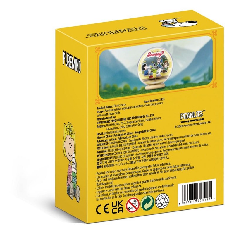 El diseño representa una encantadora escena de picnic con personajes icónicos como Snoopy, Charlie Brown, y sus amigos, dentro de un globo teatral de madera. La caja presenta un atractivo color amarillo con ilustraciones del tema, haciendo de este producto un regalo perfecto para cualquier fan de la serie.