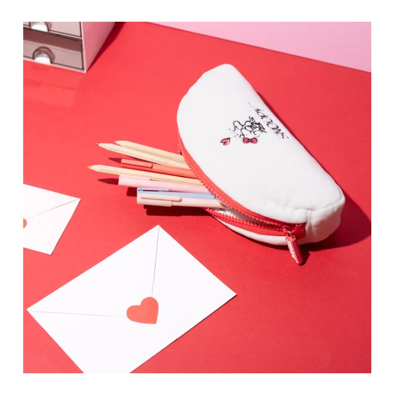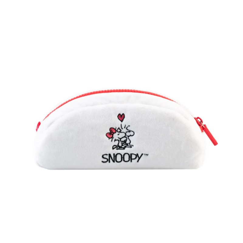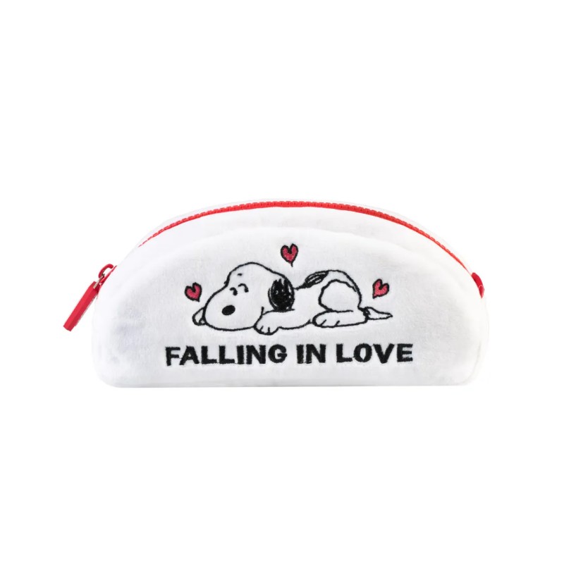 El diseño presenta gráficos bordados de Snoopy, el icónico personaje, rodeado de corazones y la frase "Falling in Love", transmitiendo un mensaje de ternura y amor. Su cierre con cremallera roja no solo asegura tus pertenencias, sino que añade un toque de color vibrante que resalta sobre el fondo blanco del estuche.