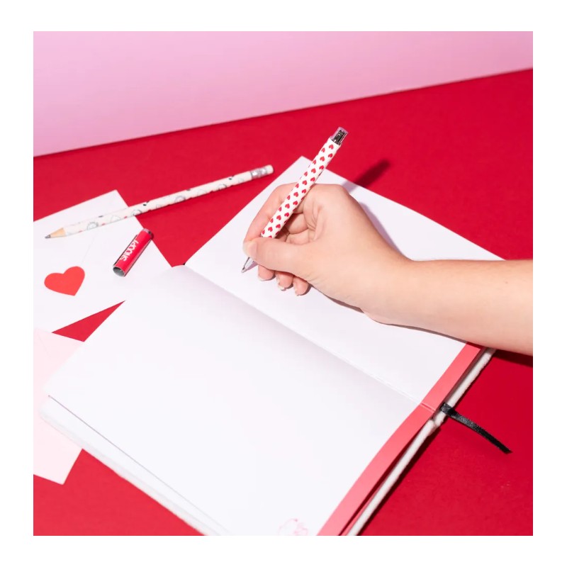 El conjunto incluye un bolígrafo de tinta negra con tapa y clip, perfecto para mantenerlo seguro en tu bolsillo o cuaderno, y un lápiz con goma, ambos decorados con delicados detalles que hacen juego con el estuche. Medido en 21 cm de ancho, 4,5 cm de alto y 4,5 cm de profundidad, es lo suficientemente compacto para cualquier mochila o bolso.