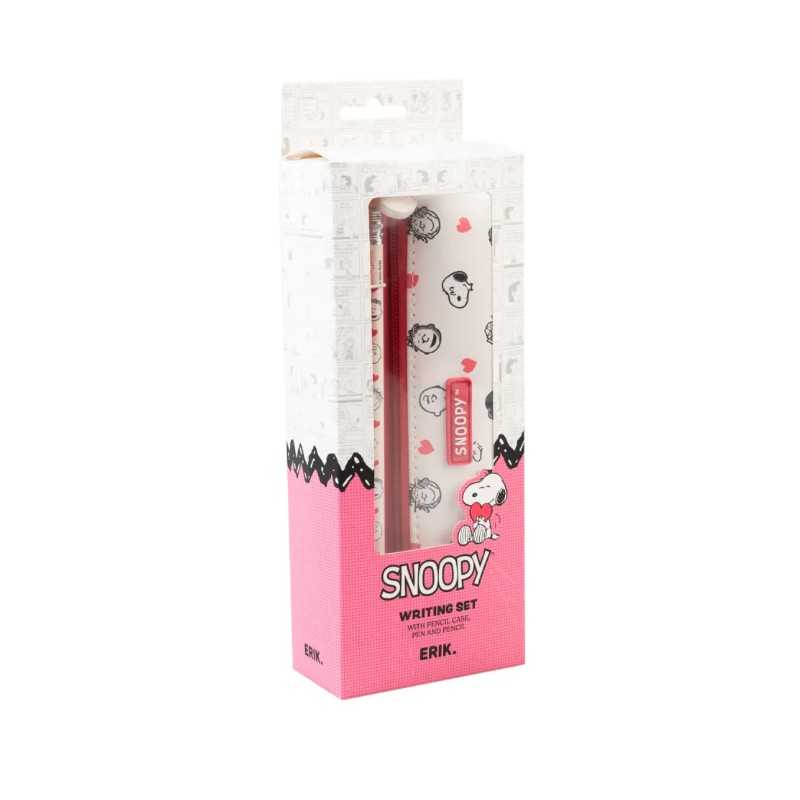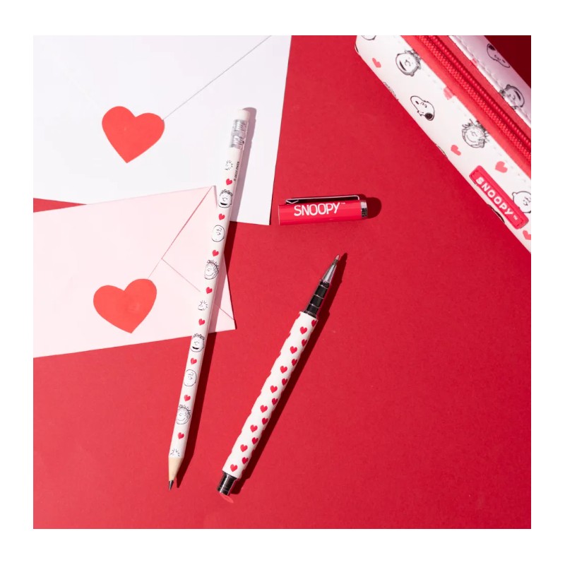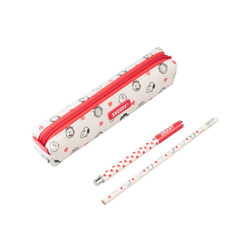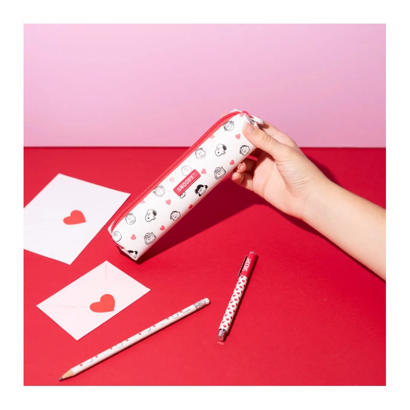 Descubre el encantador Set Estuche con Bolígrafo y Lápiz Snoopy Love Season, perfecto para los amantes de este icónico personaje. El estuche mini, con un atractivo diseño rectangular, está adornado con las adorables ilustraciones de Snoopy y corazones sobre un fondo blanco. Fabricado en poliuretano de alta calidad y forrado con poliéster, ofrece una protección duradera para tus artículos de escritura.