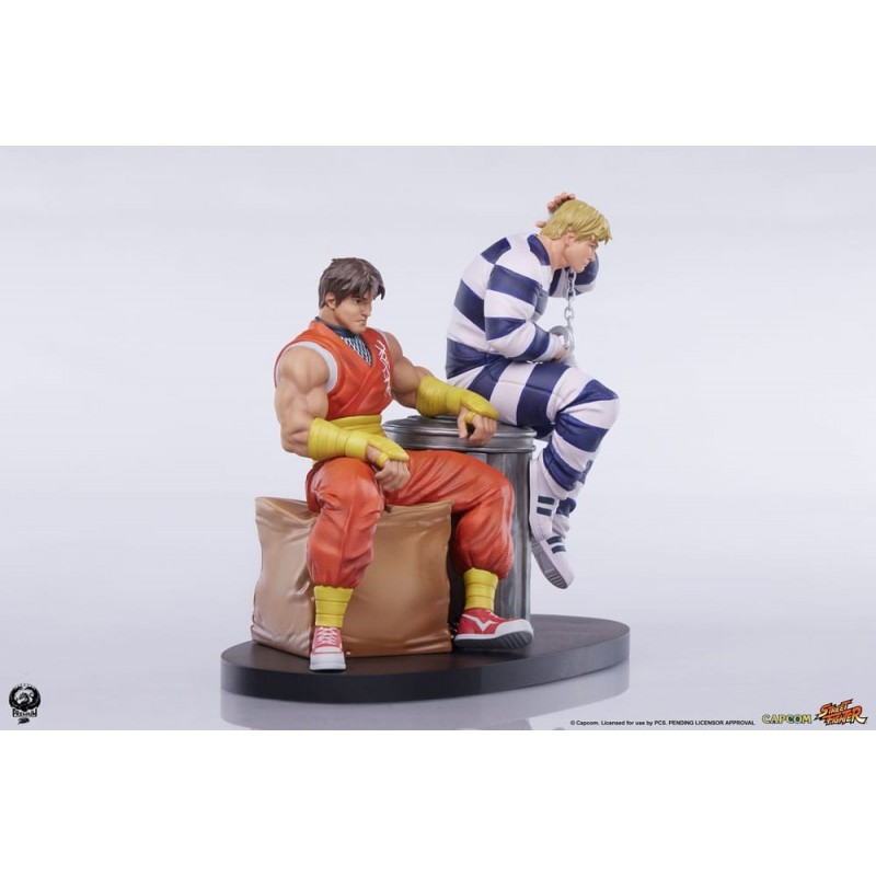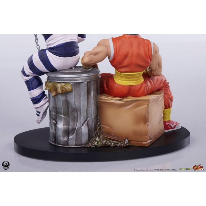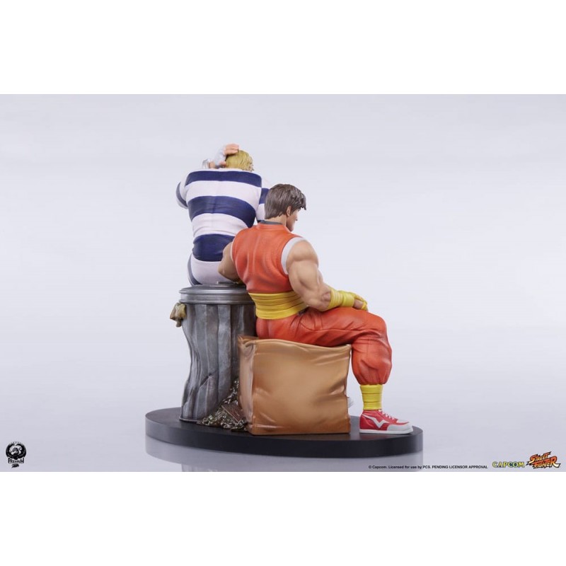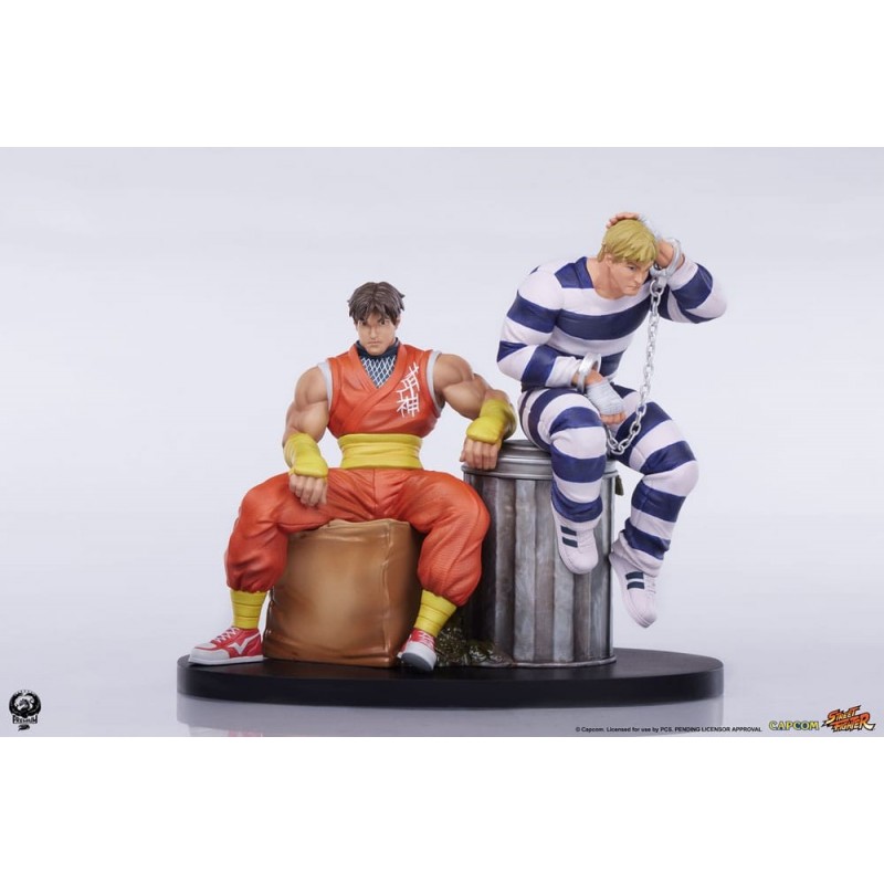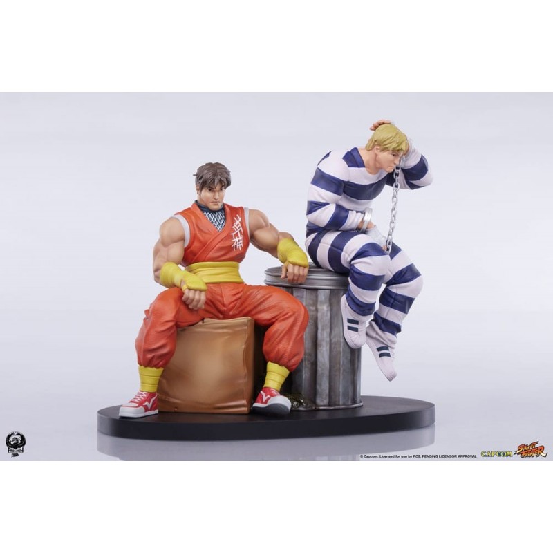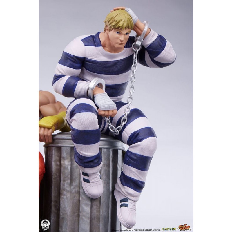 Cody, con su traje a rayas blanquiazules y detalles de cadenas, está sentado sobre un cubo de basura, mostrando su carácter desafiante. A su lado, Guy, vestido con su característico atuendo naranja y amarillo, refleja concentración y fuerza mientras está sentado sobre un saco. Ambos personajes están representados con una artesanía excepcional, desde las texturas de sus ropas hasta las expresiones en sus rostros.