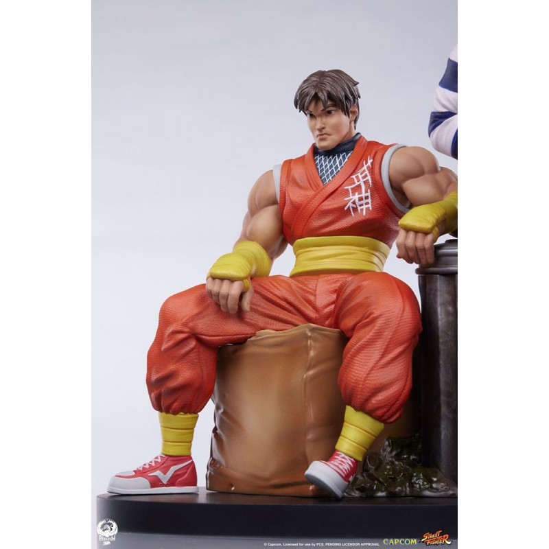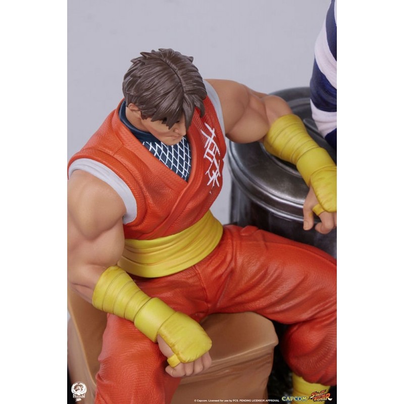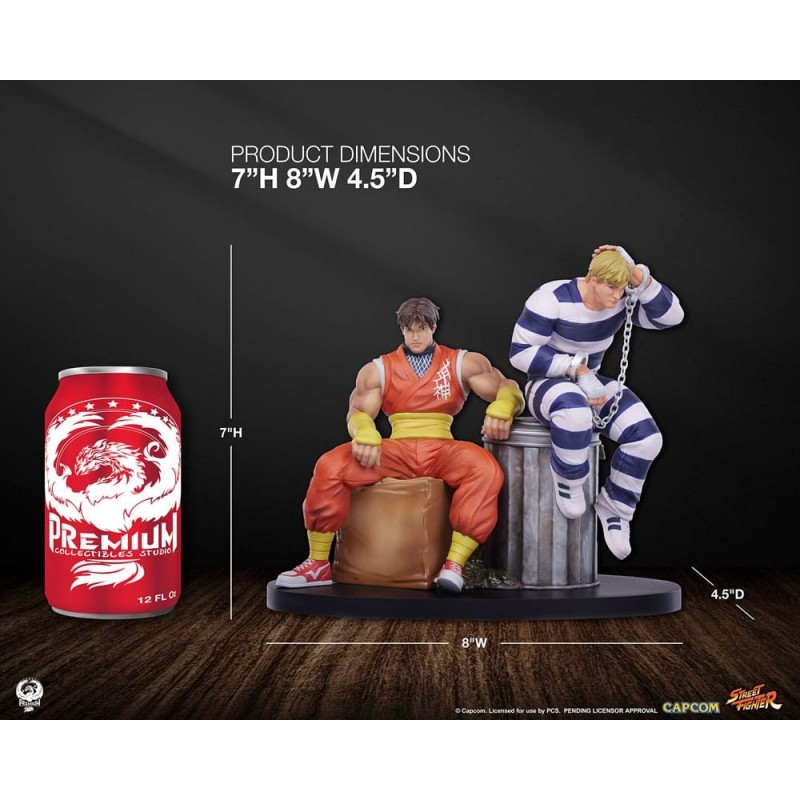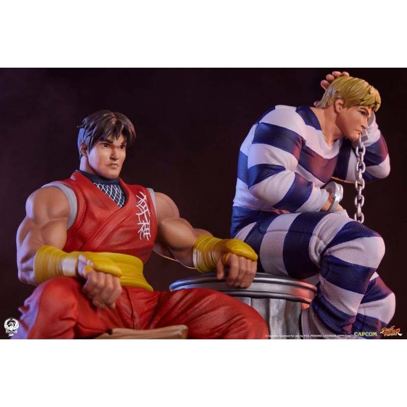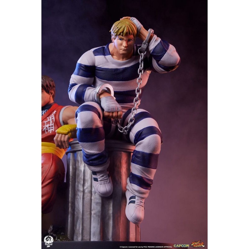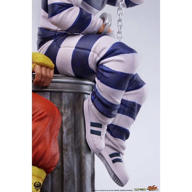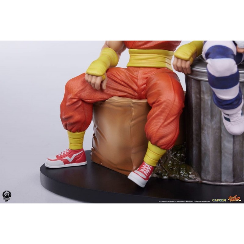 Cody, con su traje a rayas blanquiazules y detalles de cadenas, está sentado sobre un cubo de basura, mostrando su carácter desafiante. A su lado, Guy, vestido con su característico atuendo naranja y amarillo, refleja concentración y fuerza mientras está sentado sobre un saco. Ambos personajes están representados con una artesanía excepcional, desde las texturas de sus ropas hasta las expresiones en sus rostros.