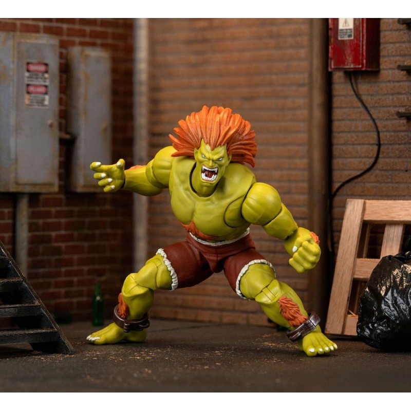 Descubre esta espectacular figura articulada de Blanka de 19 cm, inspirada en el icónico juego Street Fighter II. Fabricada por Jada Toys, esta figura a escala 1/12 destaca por su diseño detallado y colores vibrantes. Blanka luce su característico color verde intenso con cabello naranja, y su vestimenta consta de pantalones cortos marrones, complementados con detalles en las muñecas y tobillos.