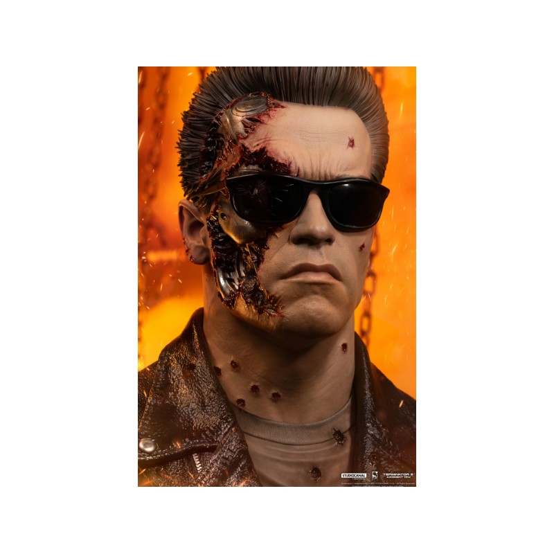 Descubre la increíble réplica a escala 1:1 del T-800, uno de los personajes más icónicos de Terminator 2, interpretado por Arnold Schwarzenegger. Con unas medidas aproximadas de 36 x 30 x 47 cm, esta pieza está fabricada en poliresina y silicona, combinando realismo con durabilidad.
