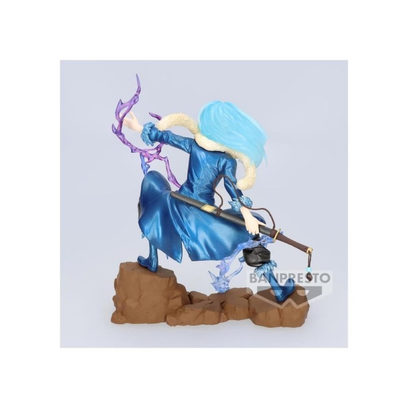 ¡Añade la figura de Rimuru Tempest a tu colección y revive las aventuras del popular manga y anime That Time I Got Reincarnated As A Slime! Banpresto presenta esta magnífica figura de 17 cm, hecha en PVC de alta calidad. Su diseño refleja a Rimuru con su característico cabello azul, vistiendo un elegante atuendo en azul oscuro con detalles blancos. La figura captura a Rimuru en una pose dinámica, rodeado de efectos mágicos morados, sobre una base que simula un terreno rocoso.