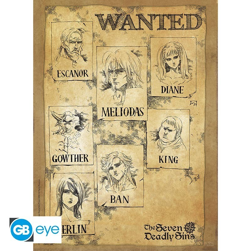 Decora tu espacio con el poster Chibi de The Seven Deadly Sins, con un diseño único que imita un cartel de 'Wanted'. Presenta a los personajes Meliodas, Escanor, Diane, Gowther, King, Ban y Merlin, cada uno con su propio retrato en estilo artístico.