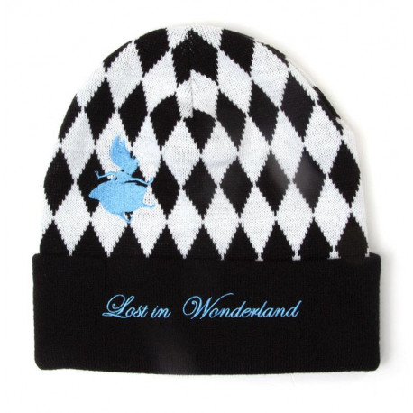 Y es que este gorro destaca por el genial estampado de rombos negros y blancos, y la silueta de Alicia bordada en hilo cuidadosamente y en ese color azul claro tan típico de su indumentaria. Además, también bordada en la parte frontal podemos leer la frase Lost in Wonderland.