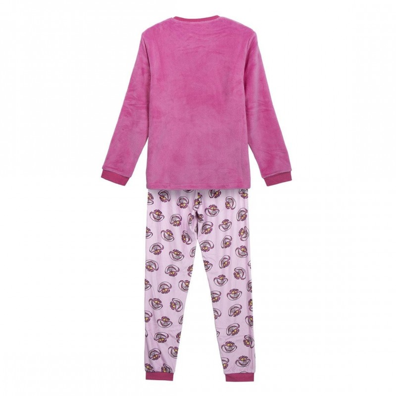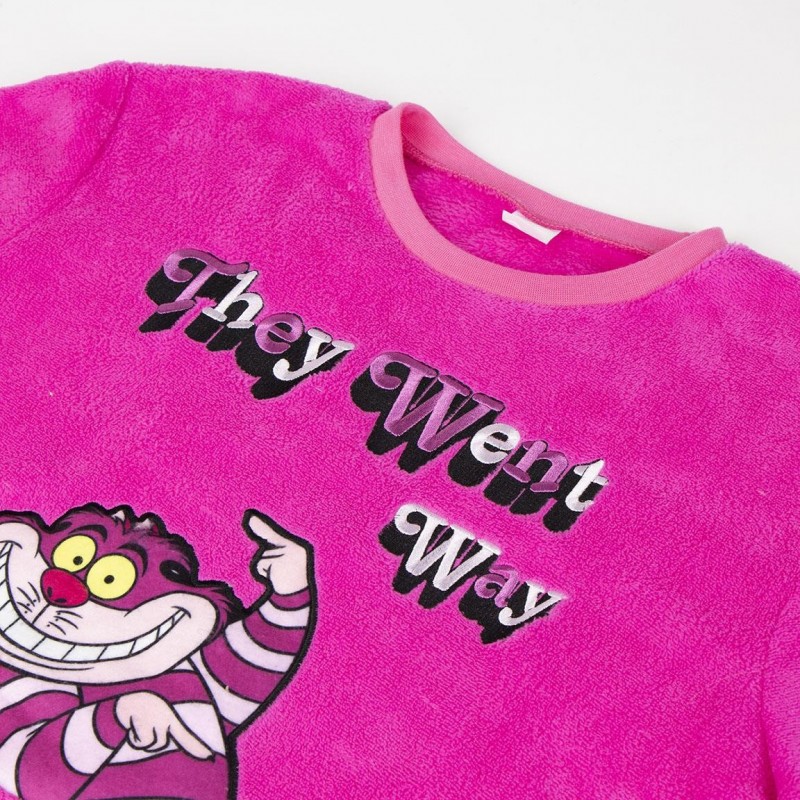 La parte superior de color fucsia destaca por su diseño con la frase "They Went That Way" y la icónica imagen del Gato de Cheshire, célebre por su sonrisa. El pantalón, a juego, presenta un fondo rosa claro con estampados repetidos del gato, añadiendo un toque de diversión y estilo.