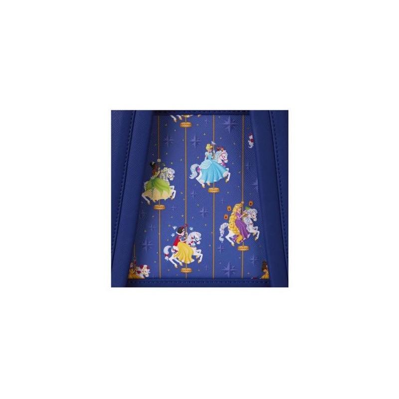 Descubre la mágica Mini Mochila Carrusel Princesas Disney LOUNGEFLY, un accesorio imprescindible para los amantes del universo Disney. Esta encantadora mochila presenta un vibrante color azul adornado con un patrón de carrusel donde desfilan varias princesas Disney sobre caballos, destacando su estilo único y sofisticado.