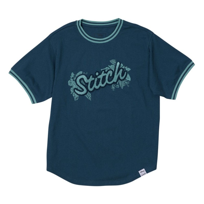 La camiseta unisex Stitch Sporty de Disney by Loungefly es una prenda imprescindible para todo fan de Disney. Confeccionada en un 100% algodón Jersey, ofrece una comodidad superior y un ajuste perfecto. Su diseño presenta un vibrante color azul marino con el nombre 'Stitch' en el frente rodeado de detalles florales, que resalta la personalidad traviesa de este querido personaje. Los ribetes en contraste en las mangas y el cuello añaden un toque deportivo y moderno.