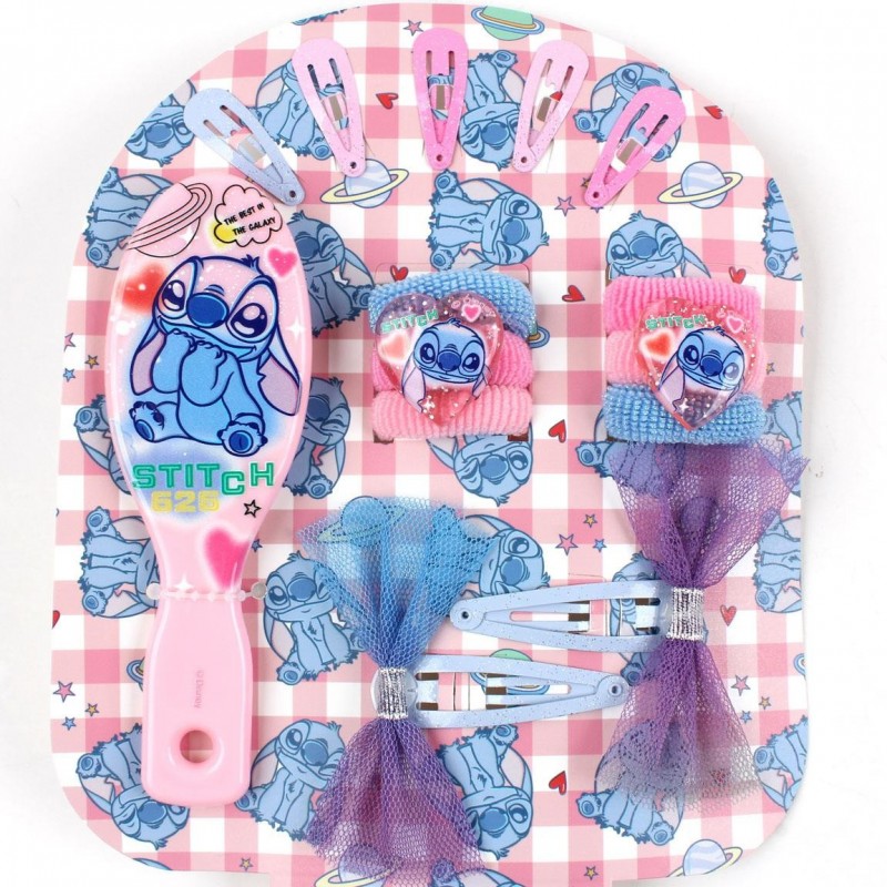 El conjunto incluye una práctica brocha con diseño de Stitch en tonos rosados, perfecta para desenredar el cabello con suavidad. Además, cuenta con pinzas para el cabello en colores rosa y azul con un toque brillante, ideales para mantener el cabello en su lugar con estilo. Los lazos de tul en tonos azul y púrpura le añaden un toque especial y elegante.