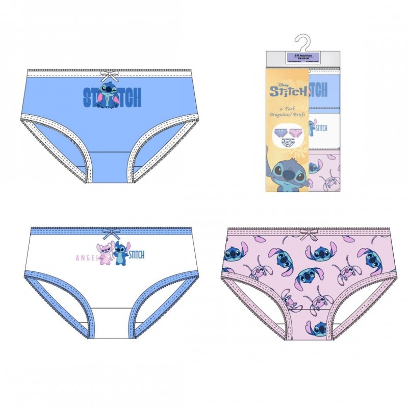 Descubre el encanto y la comodidad con este pack de 3 braguitas de Stitch para niñas, confeccionadas en suave algodón 100%. Cada conjunto incluye tres diseños adorables y coloridos: uno en azul con un estampado del querido personaje Stitch, otro blanco con Stitch y Angel, y un diseño rosa con múltiples imágenes de Stitch. Las braguitas están diseñadas para proporcionar confort durante todo el día, siendo ideales para el uso diario. Disponibles en las tallas T02/03 a T06/08. Este set no solo garantiza comodidad, sino también un toque divertido y encantador a la ropa interior de las más pequeñas.