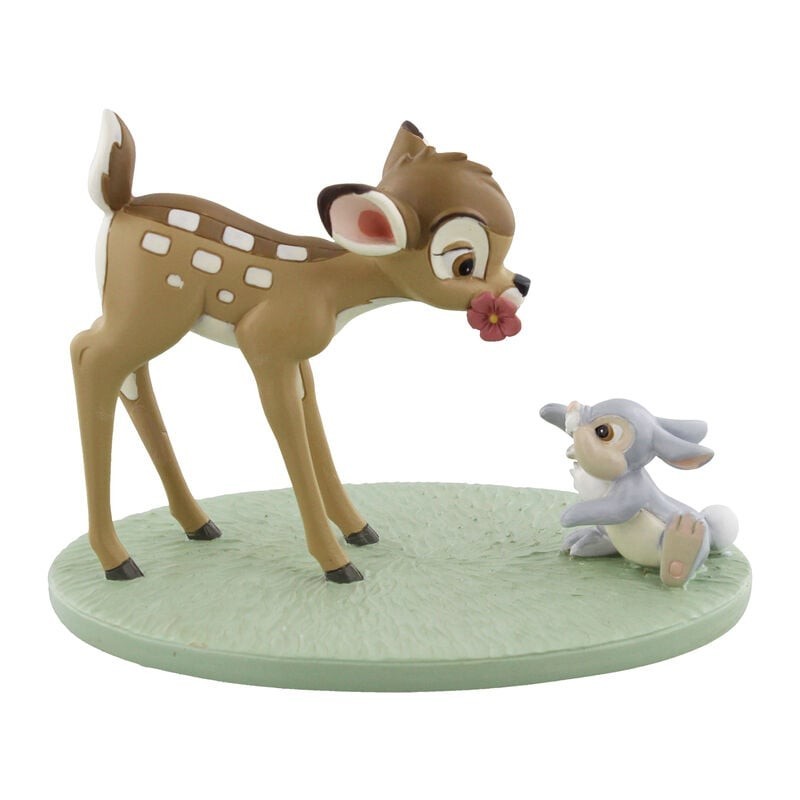 Descubre la ternura de la amistad con esta encantadora figura de Bambi y Tambor de Disney, fabricada por WIDDOP & Co.. Este producto con licencia oficial captura la magia del clásico cuento animado, mostrando a Bambi con una flor en la boca junto a su fiel amigo Tambor. Ambos personajes están esculpidos con atención al detalle en una base verde que simula un prado, añadiendo un toque natural a la escena. Las expresiones vivas y los colores vibrantes los convierten en una pieza ideal tanto para coleccionistas como para amantes de Disney. Perfecto para decorar cualquier espacio, ya sea como un regalo inolvidable o un capricho personal que traerá un toque de nostalgia y alegría a tu hogar.