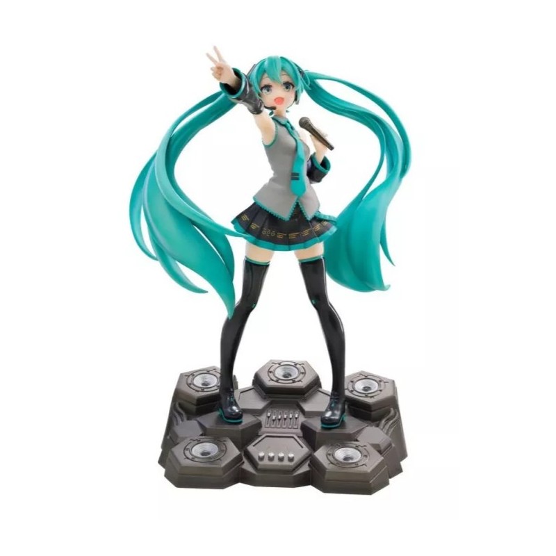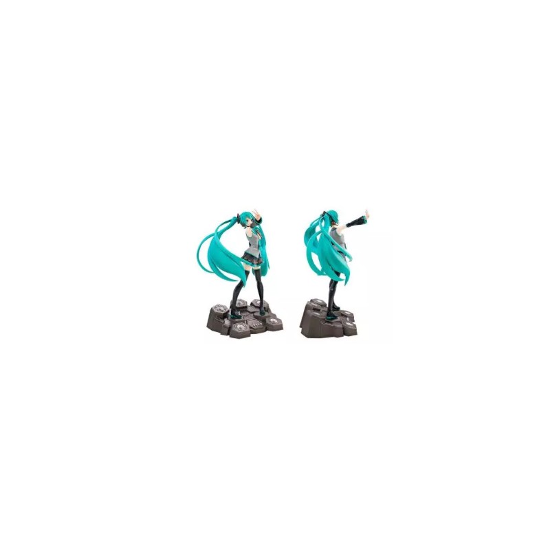 La figura coleccionable de Hatsune Miku es una obra maestra que captura la esencia de este icónico personaje del mundo Vocaloid. Con su característico cabello largo y azul, Miku sostiene un micrófono mientras adopta una pose dinámica sobre una base decorada que simula un escenario.