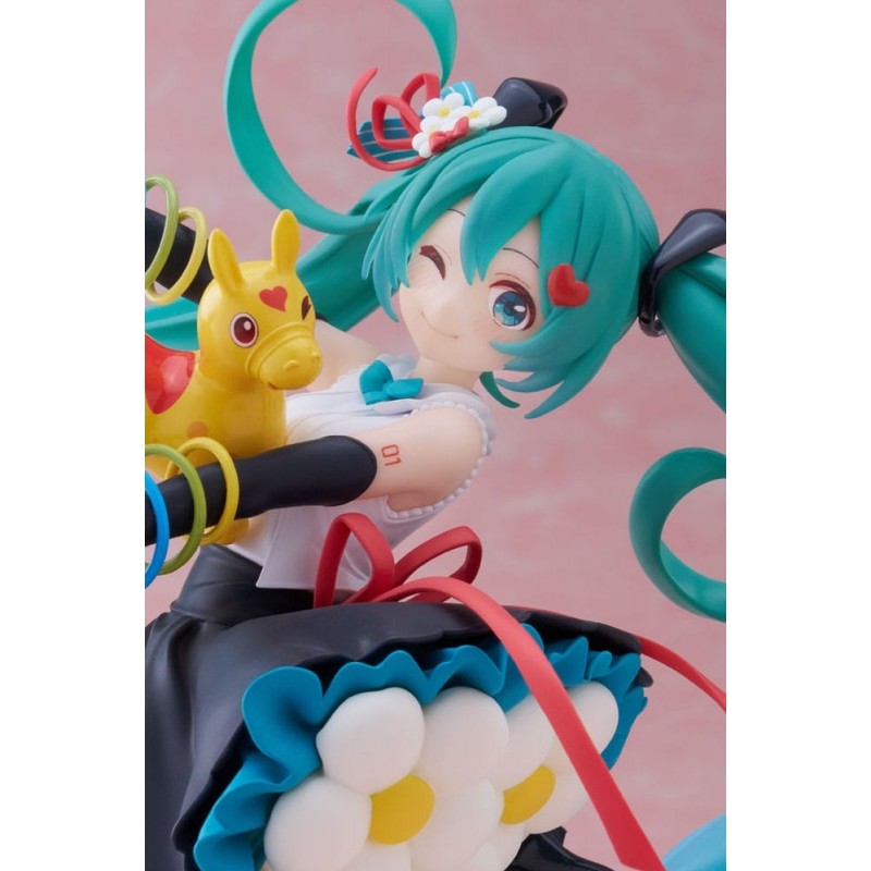 Esta estatua de Hatsune Miku x Rody AMP+ Thank You Ver. es una pieza impresionante que captura la esencia de uno de los personajes más icónicos del mundo del anime. Con un tamaño de aproximadamente 20 cm, está fabricada en PVC de alta calidad y viene acompañada de una base sólida que garantiza su estabilidad.