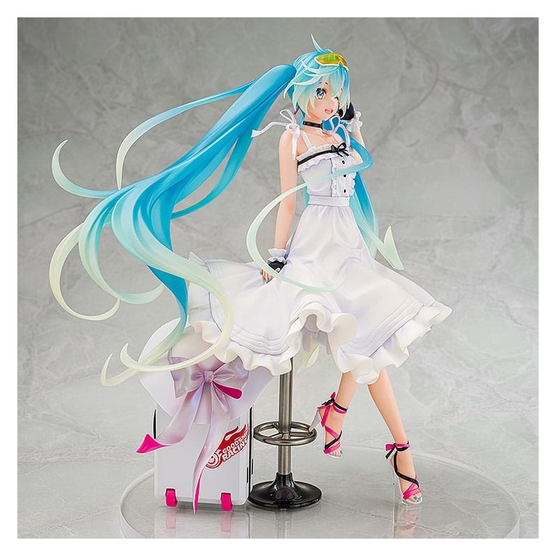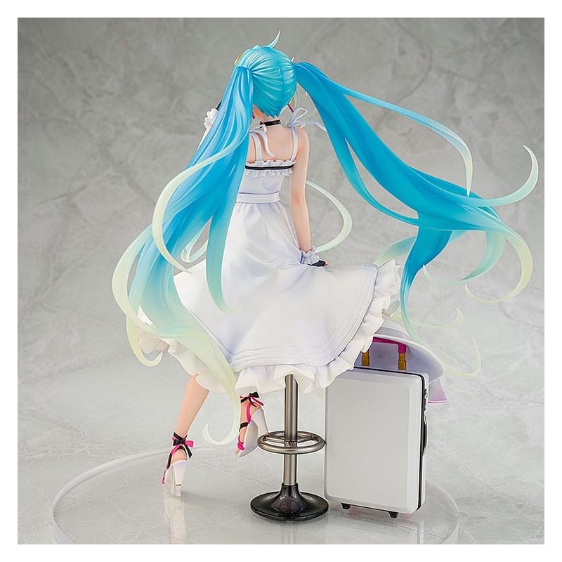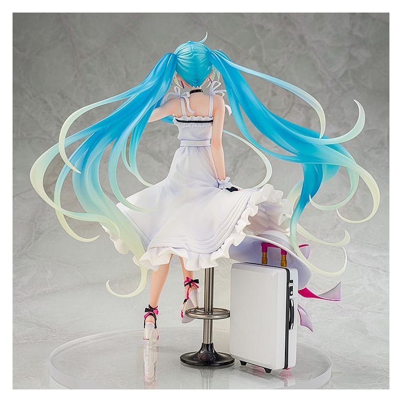 Descubre la elegante estatua de Hatsune Miku GT Project en su versión Vacation Style, diseñada meticulosamente para los verdaderos fans del manga y anime. Esta estatua, fabricada por Wonderful Works, mide aproximadamente 24 cm y está elaborada en PVC de alta calidad. Su acabado en blanco puro realza su vestido veraniego, mientras que los detalles coloridos de su cabello azul y los accesorios que lleva agregan un toque vibrante y fresco.