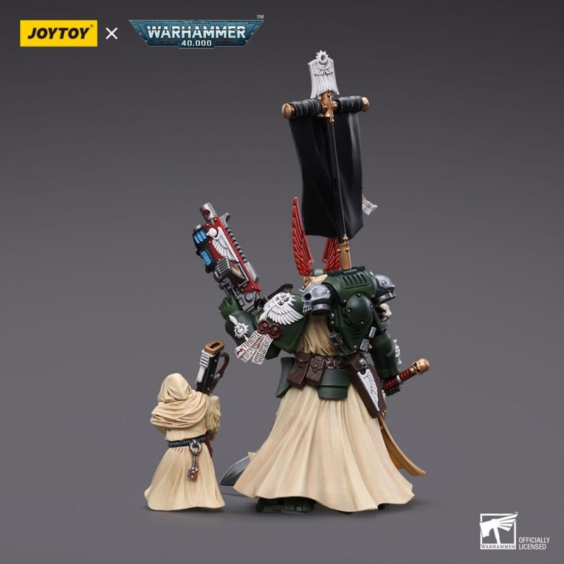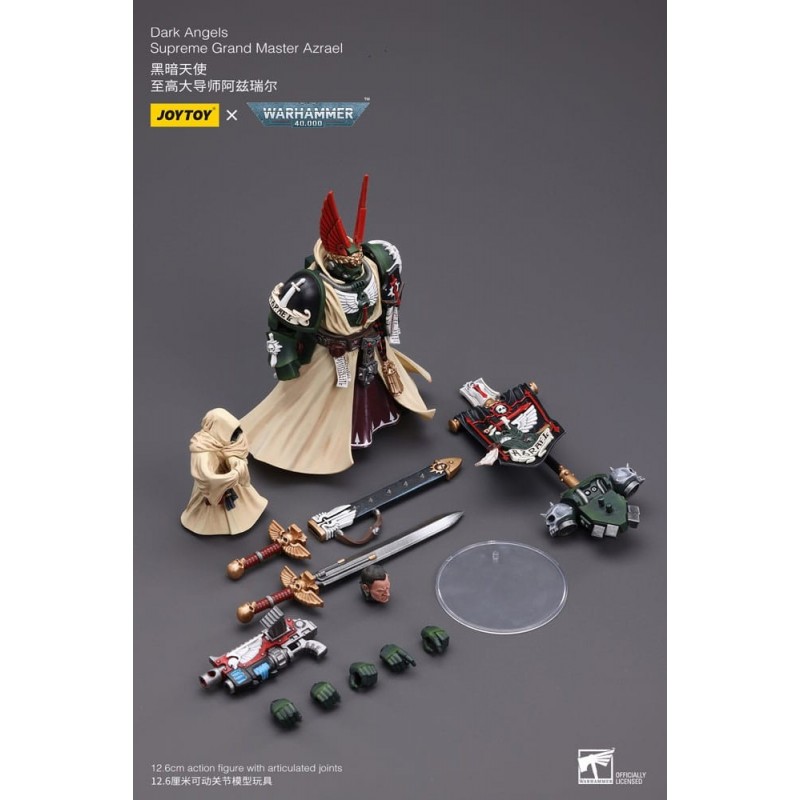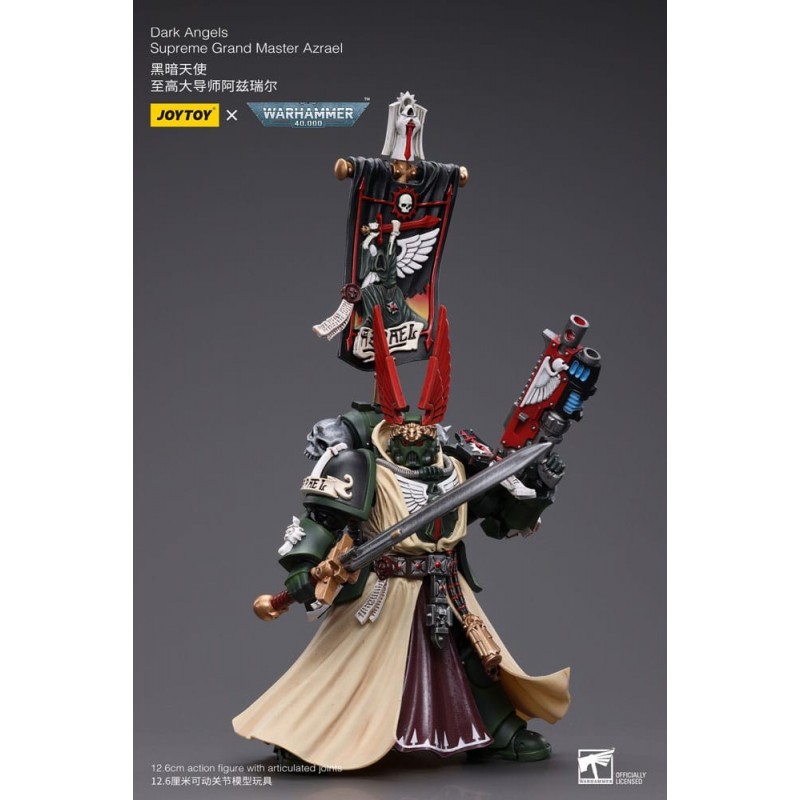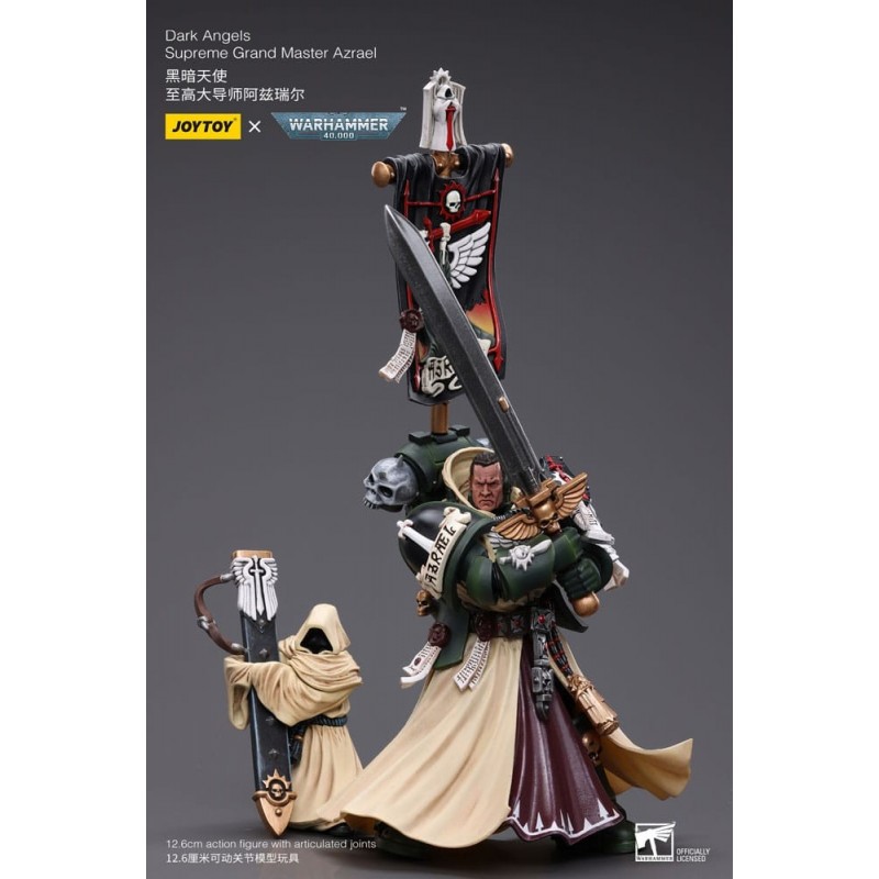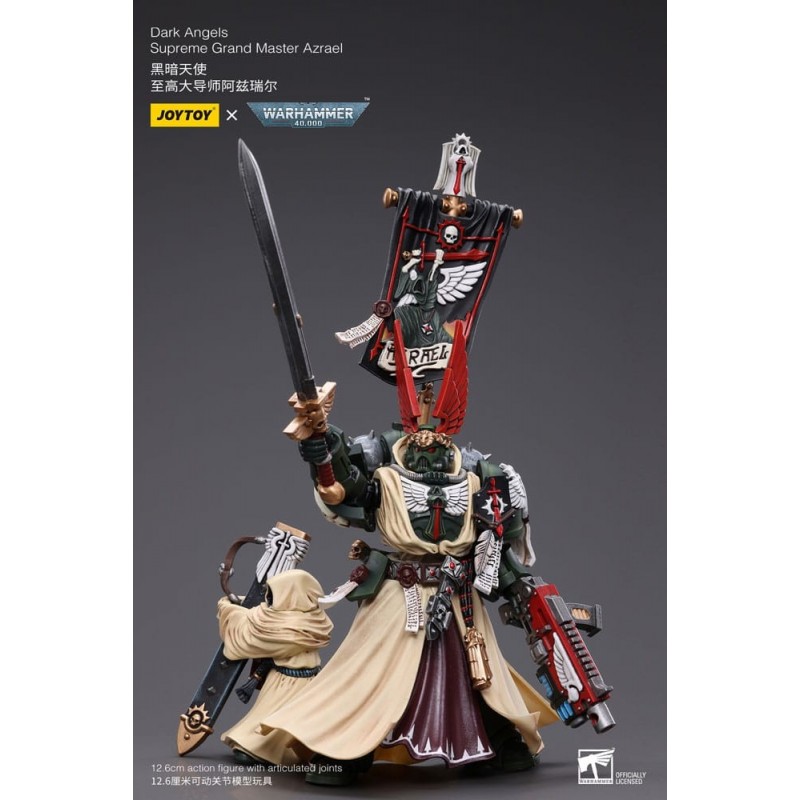 Descubre la impresionante figura articulada de Azrael, Supremo Gran Maestro de los Ángeles Oscuros del universo de Warhammer 40k. Esta figura, de aproximadamente 13 cm de alto, captura cada detalle de este emblemático personaje. Fabricada por Joy Toy, destaca por su acabado minucioso y la variedad de accesorios incluidos, como una espada detallada y el icónico estandarte. Con un diseño que refleja la mezcla de intrincadas armaduras negras y capas en tonos crema, esta pieza es un tesoro para cualquier coleccionista. Además, la figura es totalmente articulada, ofreciendo múltiples posibilidades de pose para exhibir.