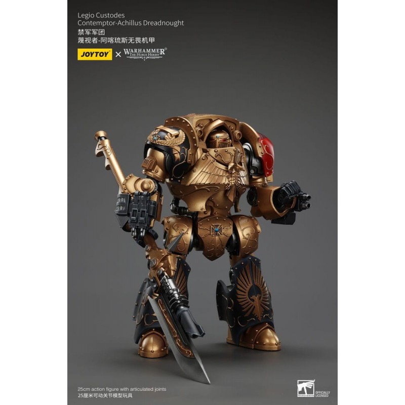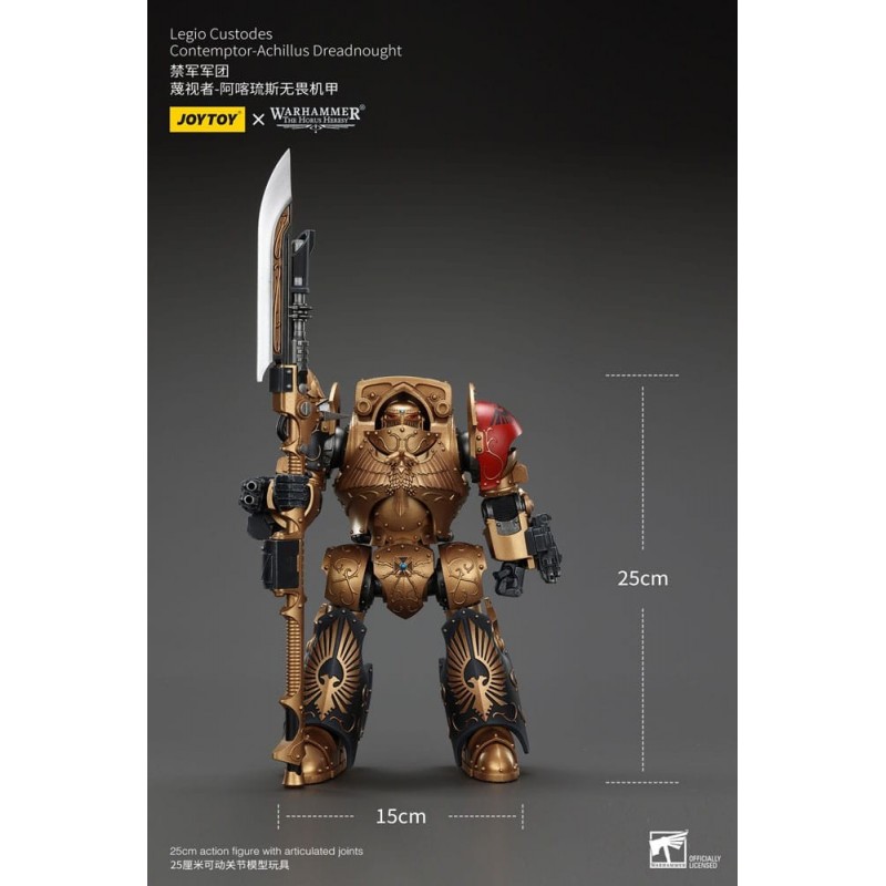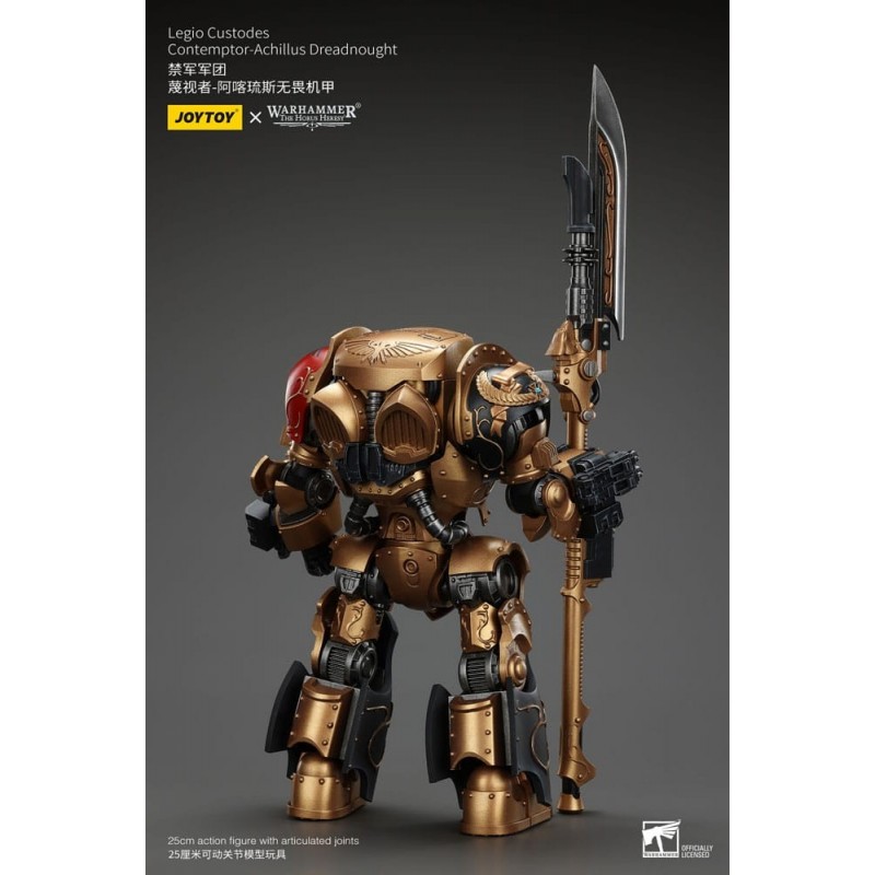 Descubre la impresionante figura articulada de Legio Custodes Contemptor-Achillus Dreadnought de Warhammer The Horus Heresy. Esta pieza, fabricada por Joy Toy, mide aproximadamente 25 cm de altura y captura con detalle el espectacular diseño del universo Warhammer. La armadura dorada con detalles en negro y rojo resalta los símbolos icónicos y el intrincado trabajo artesanal típico de los Custodes.