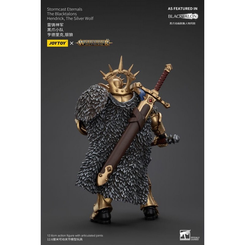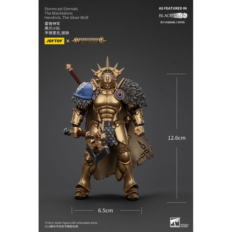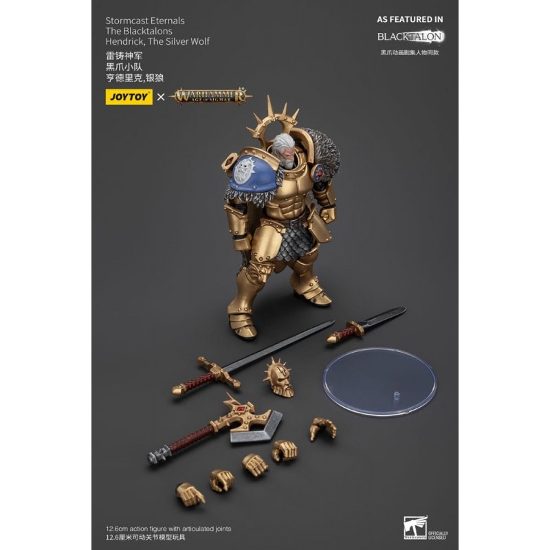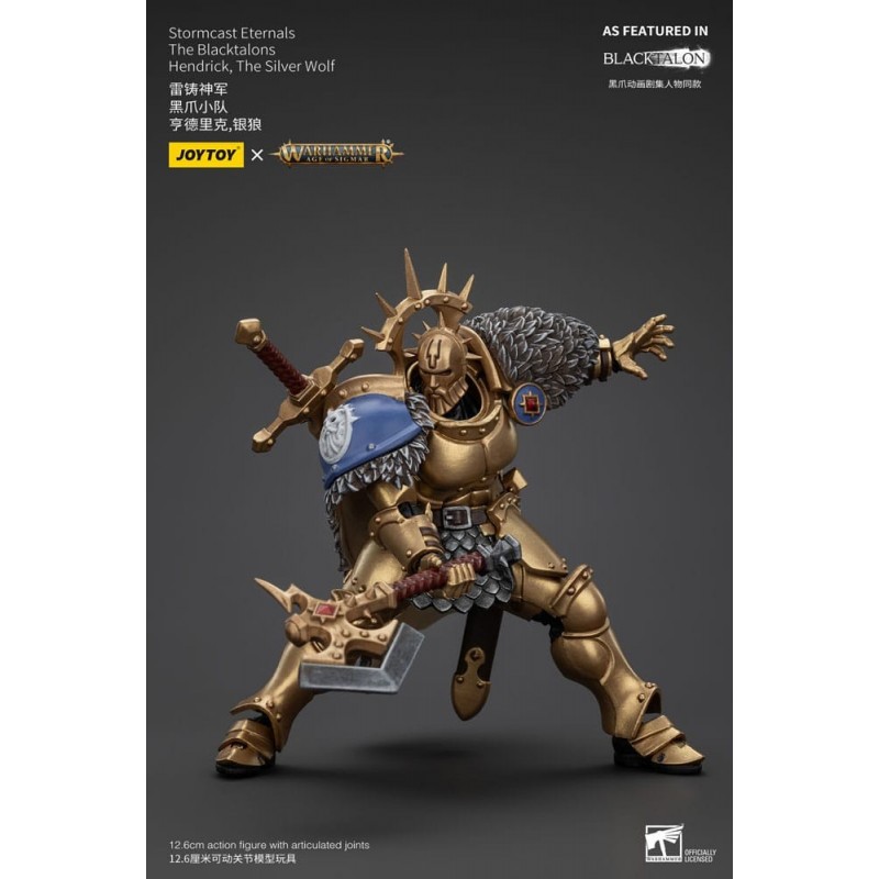Descubre la impresionante figura de acción de Hendrick The Silver Wolf, un destacado personaje de los Stormcast Eternals en el universo de Warhammer Age of Sigmar. Esta figura articulada de 20 cm, fabricada por Joy Toy, es un claro testimonio de calidad y detalle. Su armadura dorada destaca con intrincados detalles y texturas, incluyendo un manto de escamas y un escudo azul adornado con emblemas. Equipado con múltiples accesorios, como espadas y cascos intercambiables, ofrece infinitas posibilidades para coleccionistas y fans del juego.