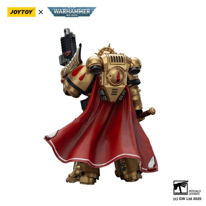 El diseño destaca por su armadura dorada con detalles en rojo y blanco, simbolizando la nobleza y ferocidad de este personaje. La figura incluye un pistola bolter pesado y una espada de poder, esenciales en el arsenal de cualquier guerrero espacial.