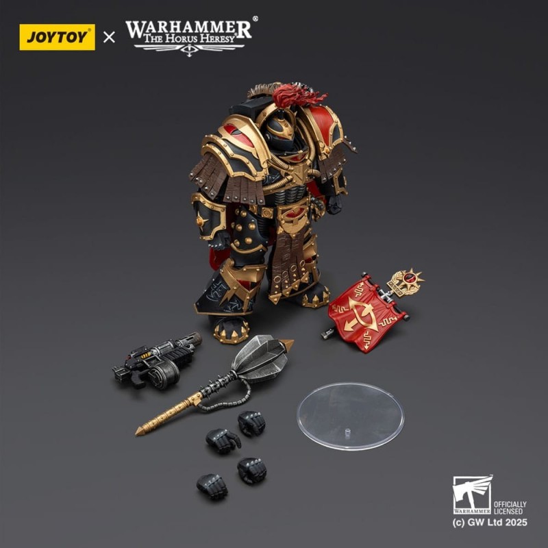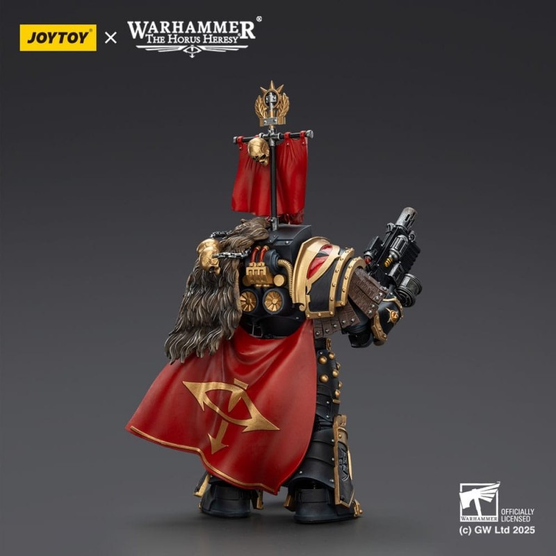 La figura destaca por su armadura detallada en tonos dorados y negros, adornada con ricos detalles en rojo. El estandarte que porta en la espalda resalta por su simbolismo, completando el look imponente del Praetor. Además, es altamente articulada, lo que te permite colocarla en diversas poses para tus batallas estratégicas.