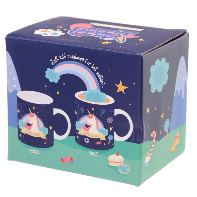 Une coupe presque magique, comme les licornes, et c'est qu' il change de couleur avec la température. Quand il est froid, nous voyons une belle photo de l'un de ces licornes, avec des cheveux roses, un smiley, adorable et les yeux fermés, parce que vous êtes en train de rêver. Mais la meilleure chose que le dessin des changements lorsque vous remplissez la tasse avec un liquide chaud, et nous voyons autour de toutes ces petites choses qui rêve: les sucettes, les couleurs des bonbons, des gâteaux...