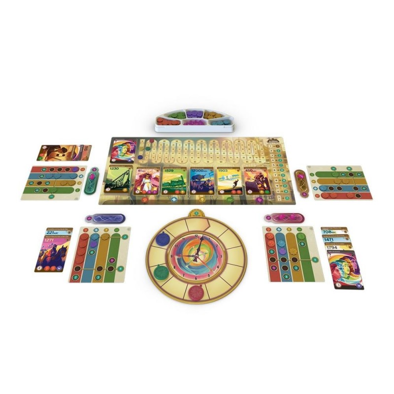 Ce set inclut plus de cent cartes d'Histoire, chacune magnifiquement illustrée et accompagnée d'un passage éducatif qui vous fait sentir que vous avez vraiment voyagé dans le temps. De plus, le jeu comprend 12 cartes Ancêtre, un tapis, des montres de poche et des jetons d'Expérience pour améliorer l'immersion thématique-éducative.