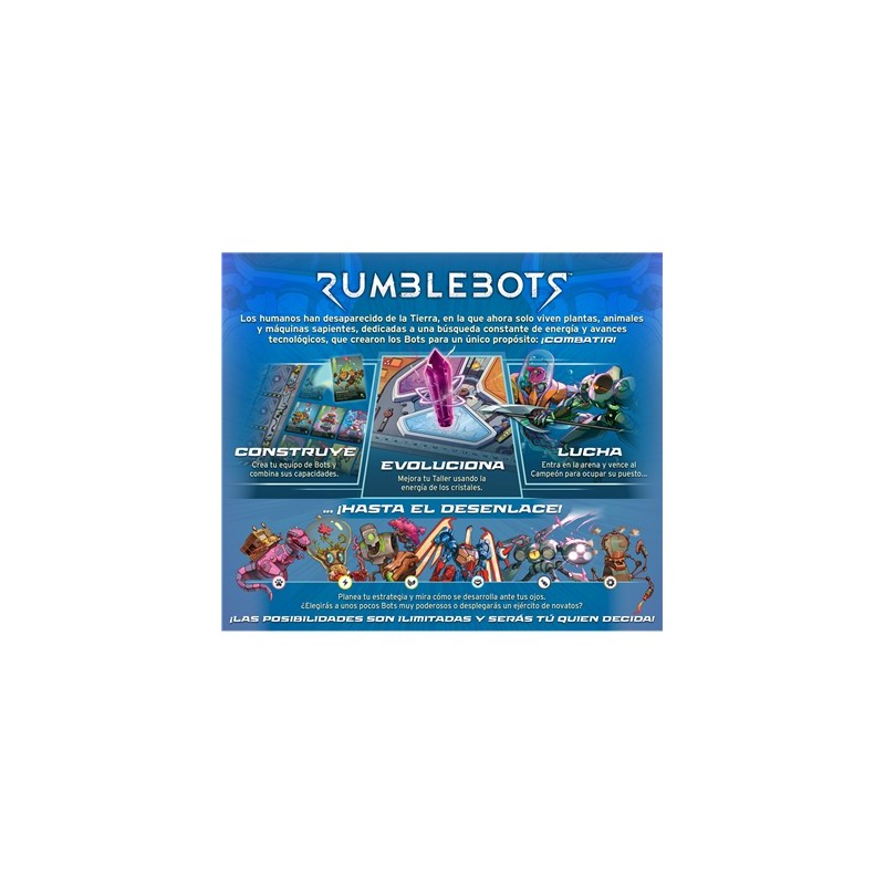 Avec des composants de haute qualité, Rumblebots garantit une expérience immersive grâce à ses 102 cartes, 30 cristaux, 8 marqueurs d'atelier, 4 plateaux d'atelier et un plateau de laboratoire. Les joueurs peuvent choisir différentes stratégies comme l'évolution, le recyclage ou l'attaque agressive, et entrer en combat pour être le dernier Bot debout.