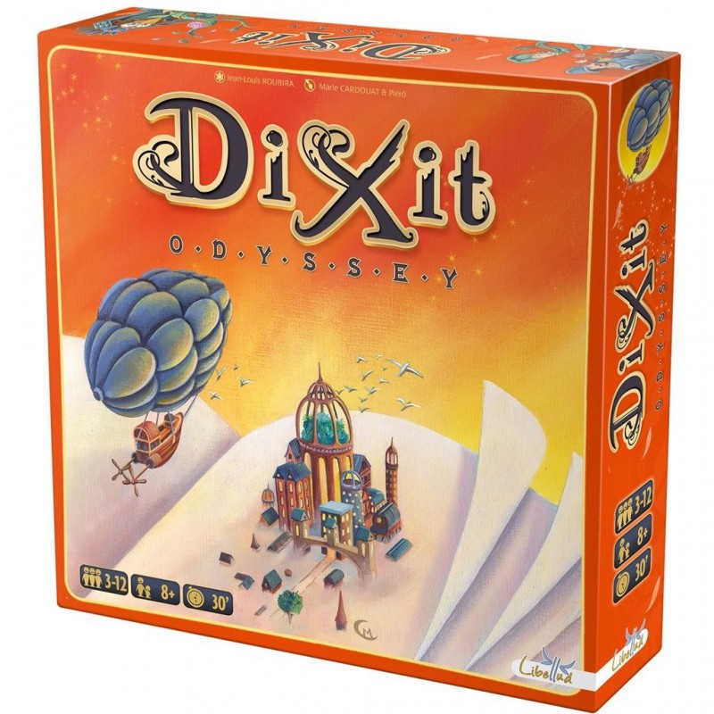Plongez dans le monde fantastique de Dixit Odyssey, un jeu de société visuellement époustouflant qui met au défi votre imagination et votre créativité. Avec des illustrations vibrantes et uniques, ce jeu présente une boîte orange avec le titre 'Dixit Odyssey' sur le devant, accompagné d'une montgolfière et d'une ville fantastique, évoquant une atmosphère de rêve.