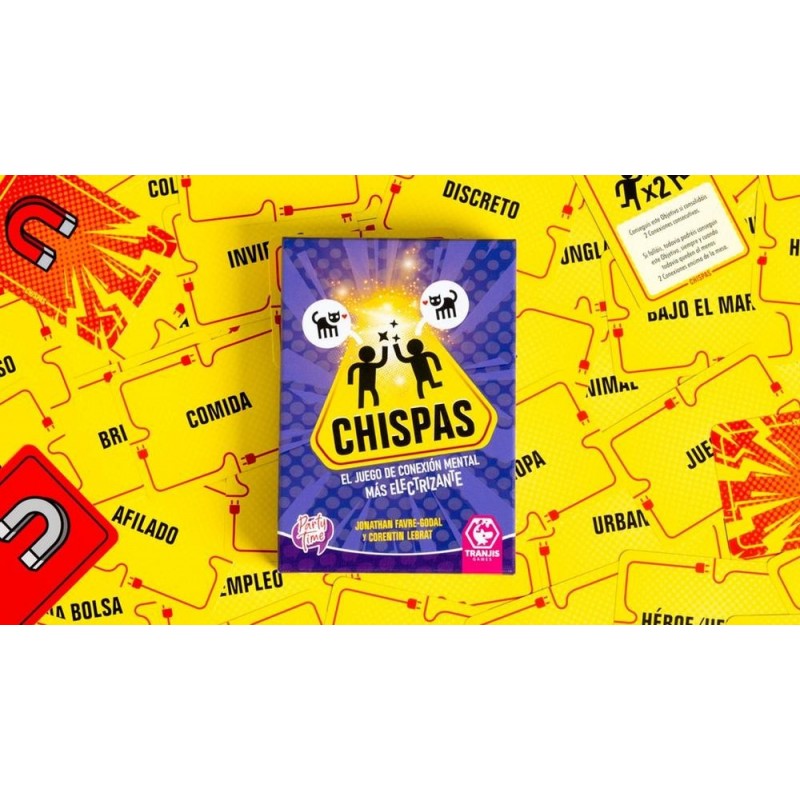 Le cœur de ¡Chispas! réside dans sa mécanique d'association d'idées. Chaque joueur contribue avec des cartes pour former des connexions, créant un réseau conceptuel entre tous. Pendant le jeu, en duo, vous devrez prouver votre harmonie en disant le même mot en même temps. Et quand vous ne participez pas directement, rejoignez l'amusement à l'aide d'un aimant !