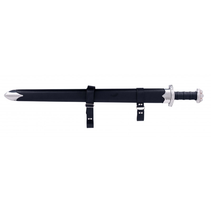 Le manche, enroulé de cuir, offre une prise ferme et confortable, tandis que le fourreau en bois recouvert de cuir avec des attaches métalliques assure un rangement sécurisé. Pesant 1173 grammes sans le fourreau, cette épée est non seulement une pièce de collection mais aussi un cadeau original pour tout amoureux de la culture viking.