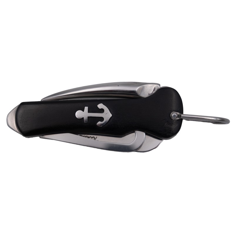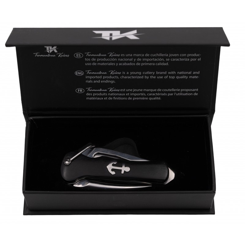 Découvrez le couteau de maître d'équipage Tramuntana N203, une pièce unique de savoir-faire alliant style et fonctionnalité. Son manche en bois d'ébène impressionnant ajoute non seulement une touche de sophistication, mais garantit également une prise en main confortable. Ce couteau est doté d'une lame en acier 440 de 6,5 cm, parfaite pour toute tâche maritime ou terrestre. De plus, il est équipé d'un tournevis plat, d'une pointe à défaire les nœuds, et d'une boucle, éléments essentiels pour toute aventure nautique. Le détail de l'ancre en acier poli sur le manche est un hommage à l'esprit marin. Présenté dans une boîte élégante, c'est le cadeau idéal pour ceux qui apprécient la qualité et le design.