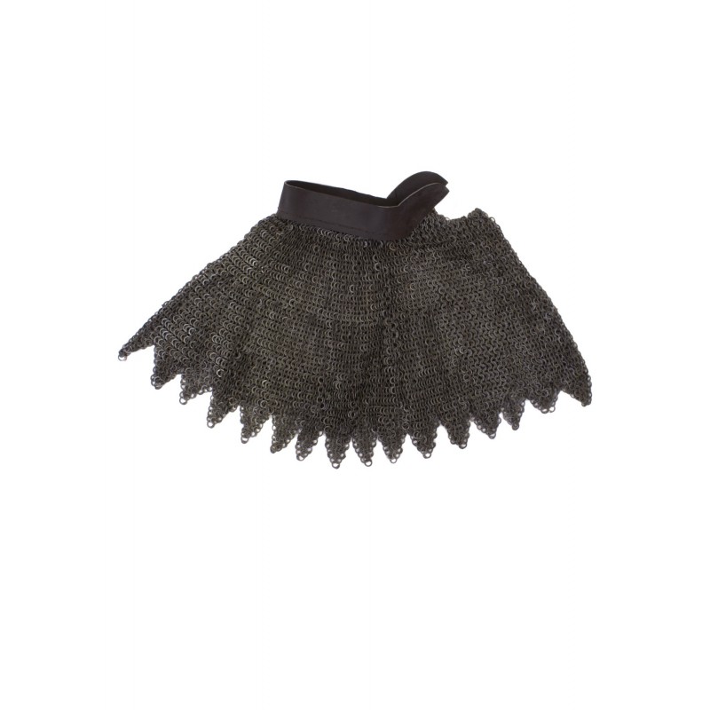 Le bord dentelé authentique et la solide sangle en cuir de 55 cm cousue sur la partie supérieure garantissent un ajustement sûr et confortable. L'aspect naturellement fini et légèrement huilé offre un look authentique et durable, tandis que son diamètre intérieur d'environ 8 mm et son épaisseur de 1,8 mm assurent une protection robuste. Pesant environ 2,4 kg, cet aventail est entièrement prêt pour le combat.