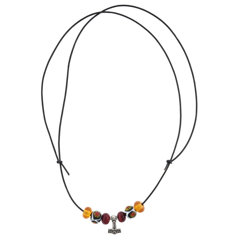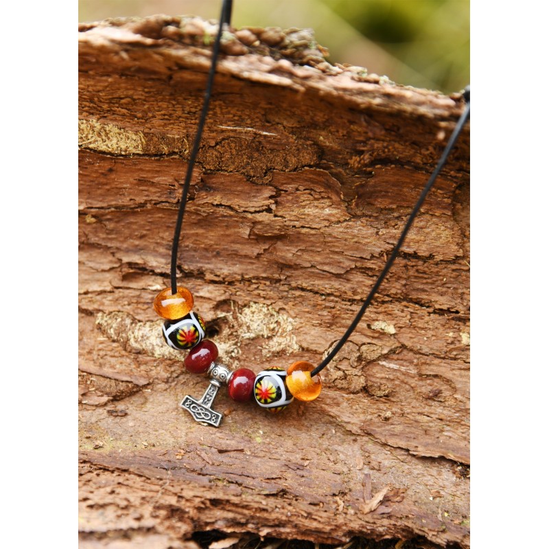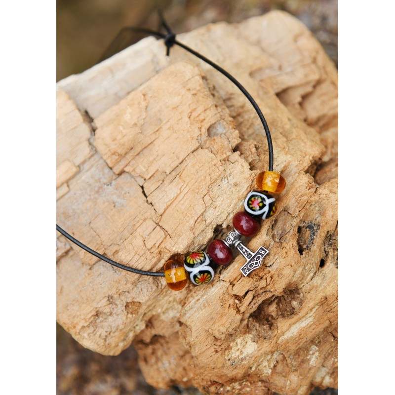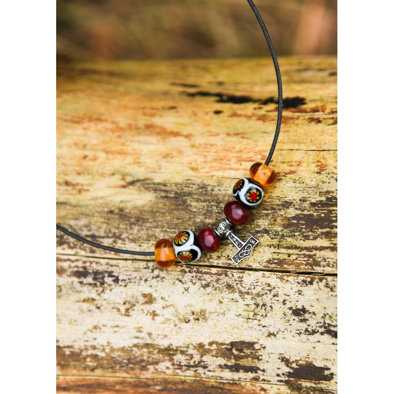 Ce collier viking présente un pendentif Mjölnir en argent sterling 925 authentique et des perles de verre artisanales. Les perles colorées sont inspirées des découvertes archéologiques de Hedeby, un important centre commercial de l'ère viking.