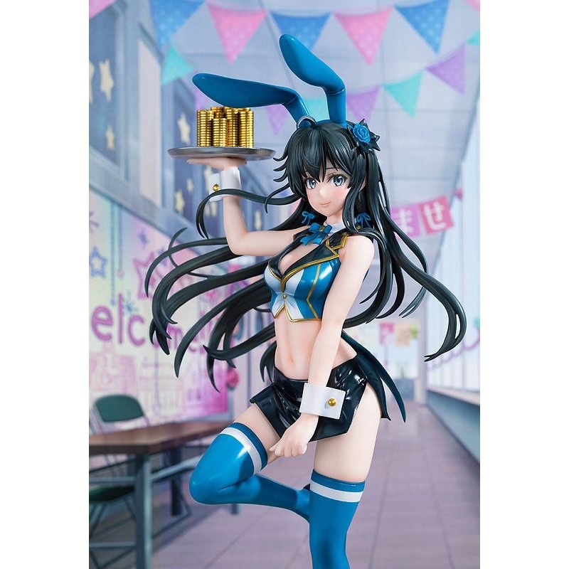 La statue représente Yukino dans une charmante tenue sur le thème du casino. Elle porte une tenue bleue moulante avec des détails dorés, accompagnée de longs bas de la même couleur et d'un nœud élégant. Ses longues oreilles de lapin bleu ajoutent une touche ludique, tandis qu'elle tient un plateau de jetons dorés, évoquant une authentique atmosphère de casino.