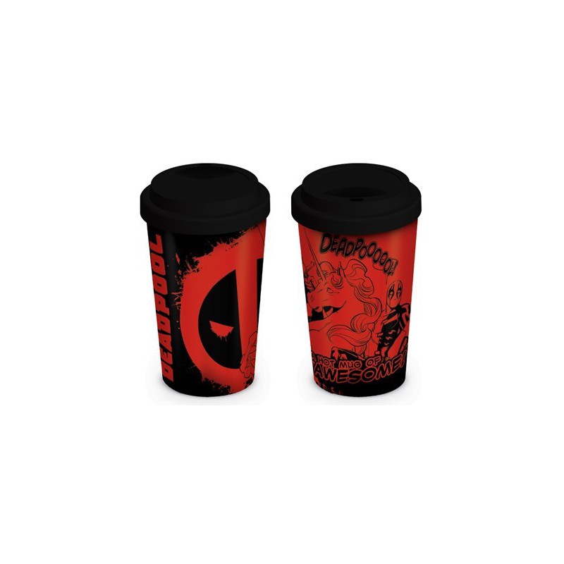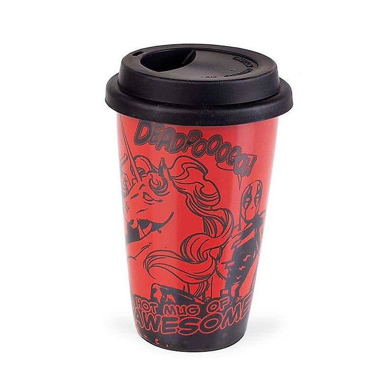 Si vous êtes un fan de Deadpool de la vérité...est venu à la tasse de voyage de finale! C'est un vrai bateau de 340 ml, faite de porcelaine qui conserve très bien la température. Il dispose également d'un couvercle en silicone avec un trou qui vous permet de boire pendant que vous marchez sans avoir à aller barboter.
