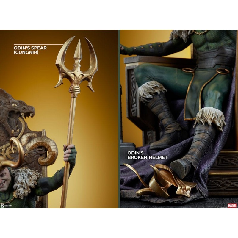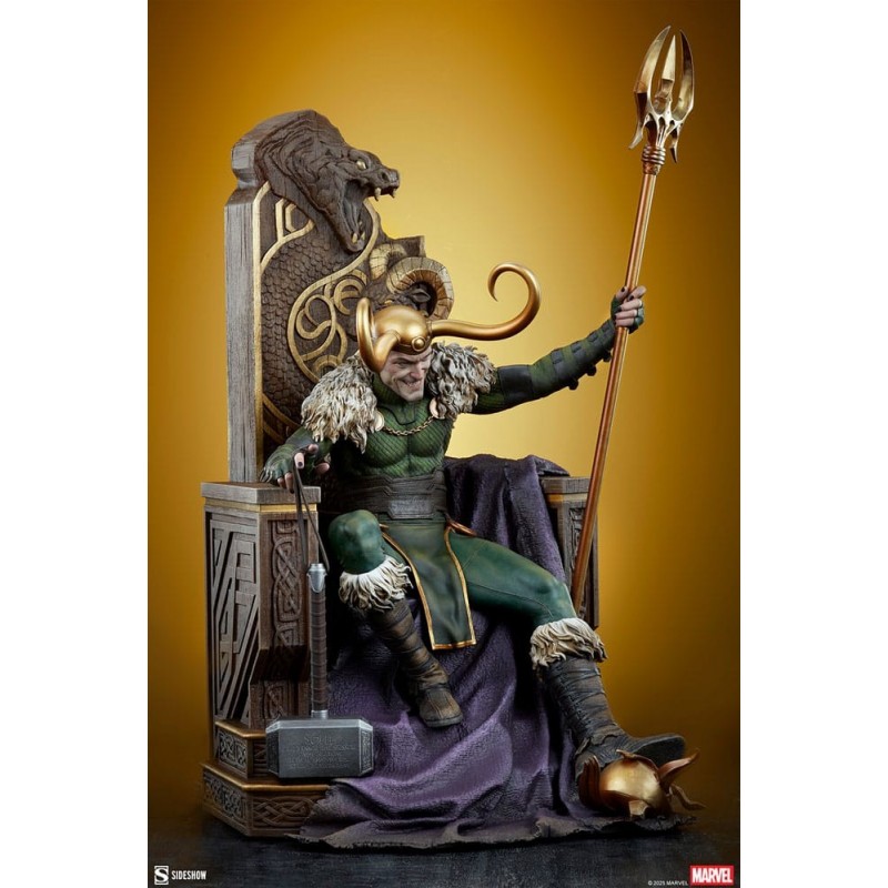La statue ne montre pas seulement Loki sur son trône, mais inclut aussi des détails emblématiques tels que le marteau Mjolnir à ses pieds et la lance d'Odin (Gungnir) dans sa main, ajoutant un élément de pouvoir et de symbolisme. Cette figure est un produit sous licence officielle de Marvel, parfait pour les collectionneurs et les fans de l'univers Marvel à la recherche d'une pièce centrale frappante pour leur collection.
