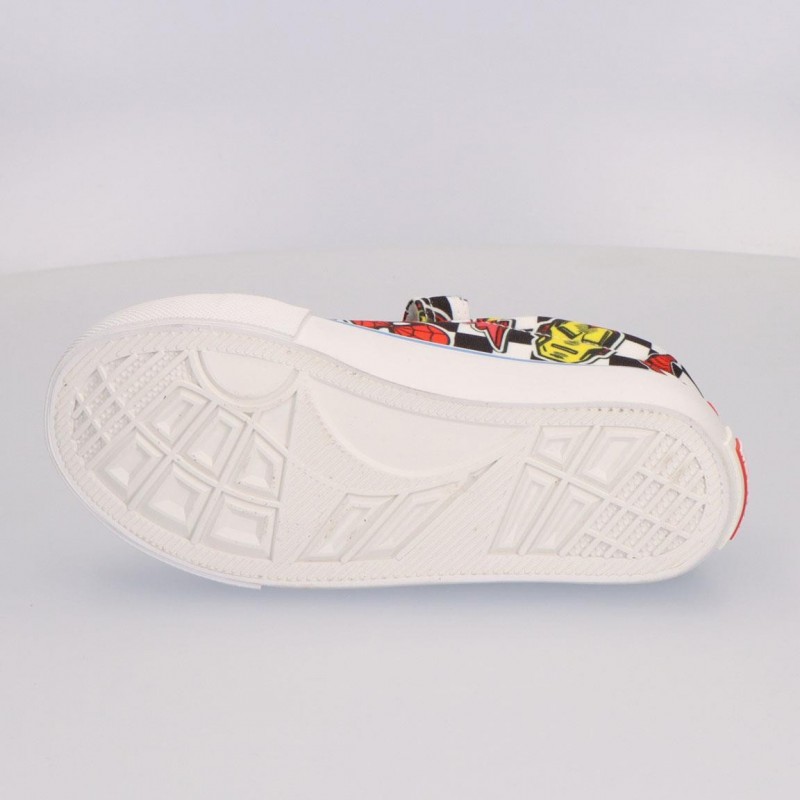 Découvrez les baskets en toile vulcanisées Marvel, idéales pour les jeunes fans de super-héros. Arborant un design coloré et vibrant, ces baskets mettent en avant des personnages emblématiques tels que Hulk, Iron Man et Spiderman. Le motif à damier en noir et blanc rehausse les couleurs vives des personnages.