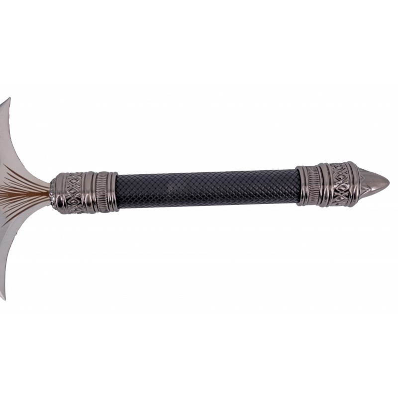 Le trident présente une lame métallique de 24 cm de long et de 3,8 mm d'épaisseur, offrant une apparence robuste et détaillée. Son manche, enroulé de similicuir noir, apporte une touche élégante et confortable, complétée par des pommeaux métalliques avec un délicat bas-relief. Avec une taille totale de 56 cm, ce trident est idéal pour décorer les studios, les cinémas maison ou les vitrines de collectionneur.