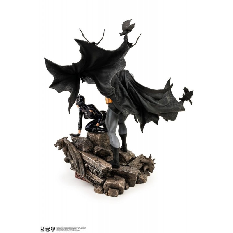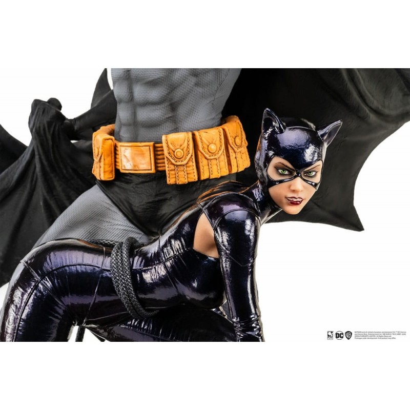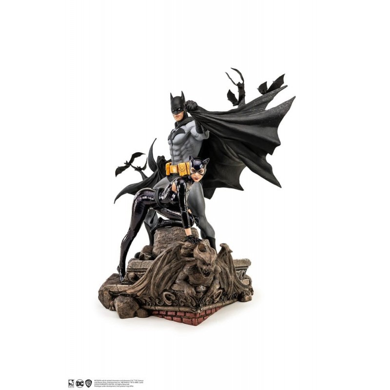 Découvrez la impressionnante statue de Batman et Catwoman par Pure Arts, fabriquée en polyrésine de haute qualité. Capturant une scène épique de DC Comics, cette statue de 67 cm offre un niveau de détail époustouflant et une finition premium. Batman est représenté dans son costume gris et noir iconique, avec une cape dynamique flottant derrière lui, tandis que Catwoman complète la scène dans un costume noir brillant élégant, adoptant une pose audacieuse et élégante.