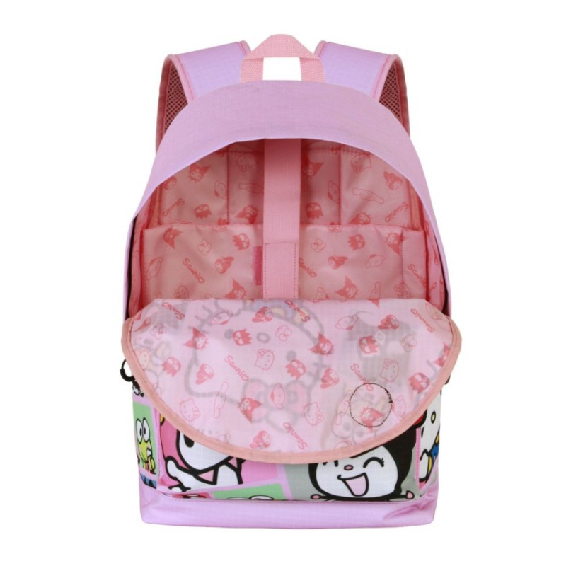 L'intérieur est soigneusement doublé avec un motif Sanrio, tandis que l'extérieur présente des graphiques de Kuromi et d'autres personnages favoris. Les bretelles ajustables assurent confort et adaptabilité, idéales pour l'école ou les sorties décontractées.