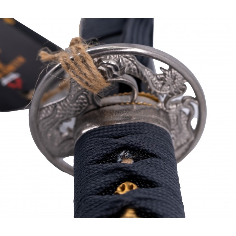 La poignée, enroulée de corde grise et de véritable peau de serpent, offre une prise en main sûre et confortable, complétée par une tsuba en acier inoxydable ajoutant une touche d'élégance. Le fourreau laqué noir est orné de détails complexes, symbolisant l'intensité et le mystère que ce katana incarne.