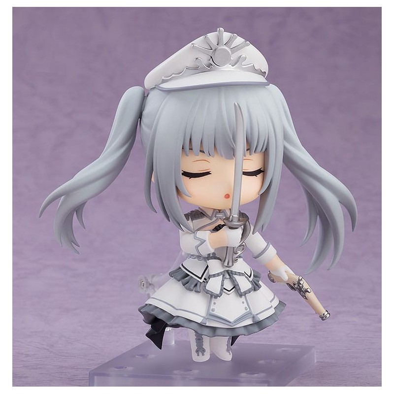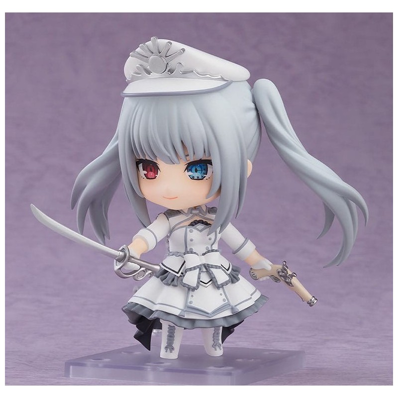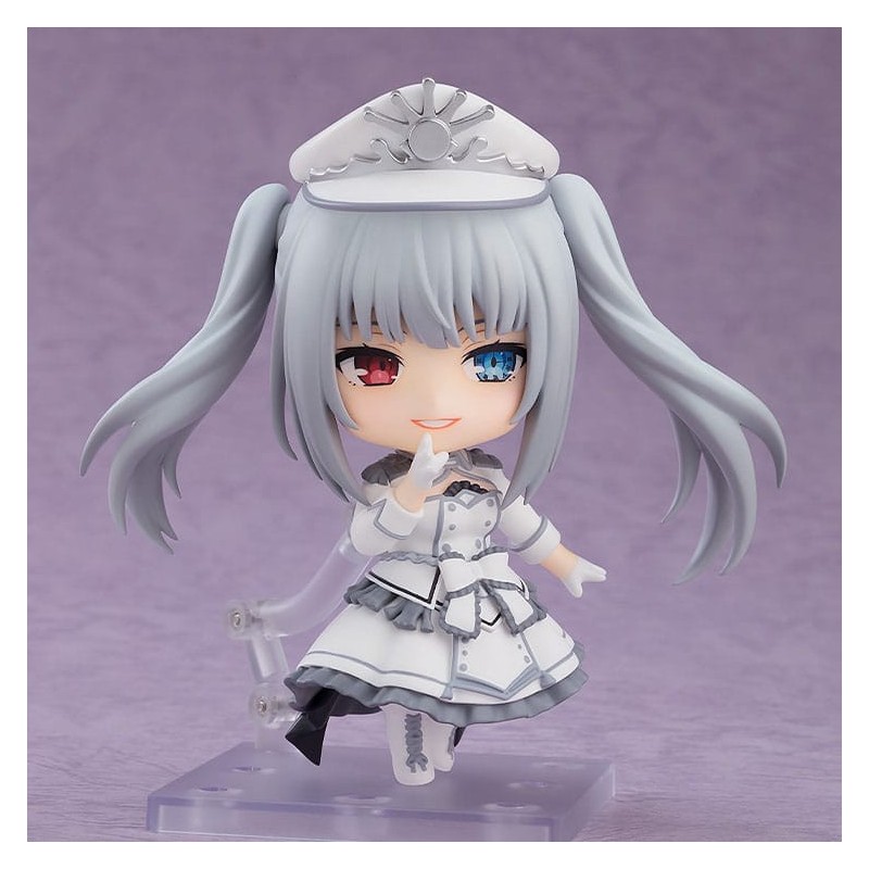 La figurine Nendoroid Queen de Date A Bullet est un ajout fantastique pour tout fan d'anime. Mesurant environ 10 cm, cette figurine articulée capture parfaitement les traits distinctifs du personnage, y compris ses cheveux gris et ses yeux de couleur différente. Elle porte une tenue blanche élégante avec des détails gris et noir, comprenant une jupe à volants et un chapeau distinctif.