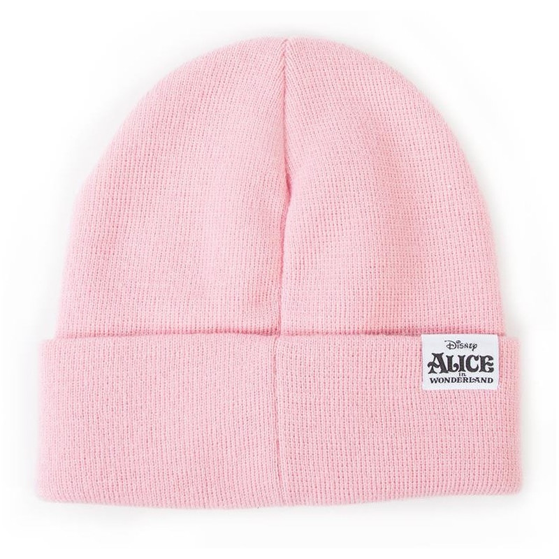 Le chapeau est de l'irrésistible couleur rose typique de ce personnage et dans sa conception, nous voyons à ce chat si particulier qu'est le Cheshire, dans un dessin brodé de fil soigneusement sur l'avant, avec le texte que Nous sommes tous fous ici (Ici, nous sommes tous fous), la phrase que dit Cheshire d' Alice lorsque vous entrez dans ce monde merveilleux plein de caractères bizarres et de lieux surprenants.