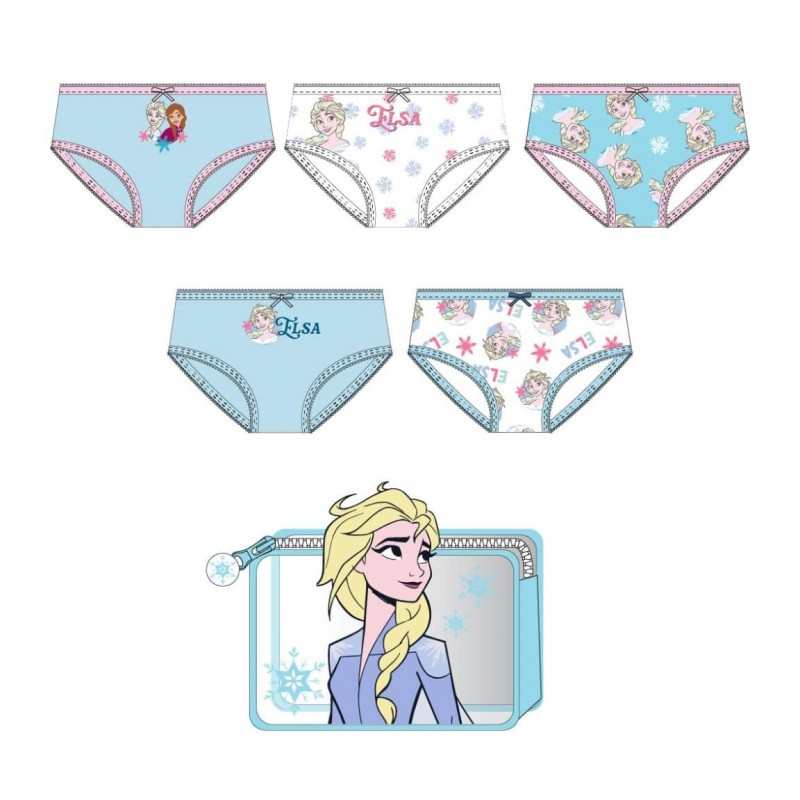 Chaque culotte présente des illustrations vibrantes des sœurs bien-aimées d'Arendelle, dans des tons bleus et blancs qui évoquent le monde glacé magique. De plus, le lot est accompagné d'une trousse à thème Frozen, idéale pour garder les sous-vêtements organisés pendant les voyages ou l'utilisation quotidienne à la maison.