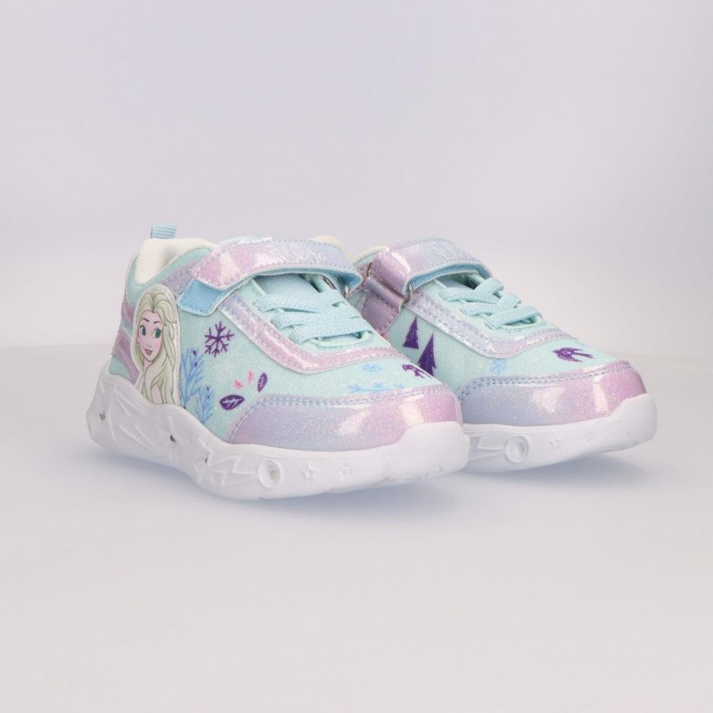 Découvrez la magie de Frozen avec ces baskets charmantes. Conçues dans des tons pastel bleu et lilas avec des détails brillants, ces chaussures capturent l'esprit de la princesse Elsa. L'extérieur est orné de motifs de glace et de neige, y compris un portrait d'Elsa, parfait pour les jeunes fans du film.