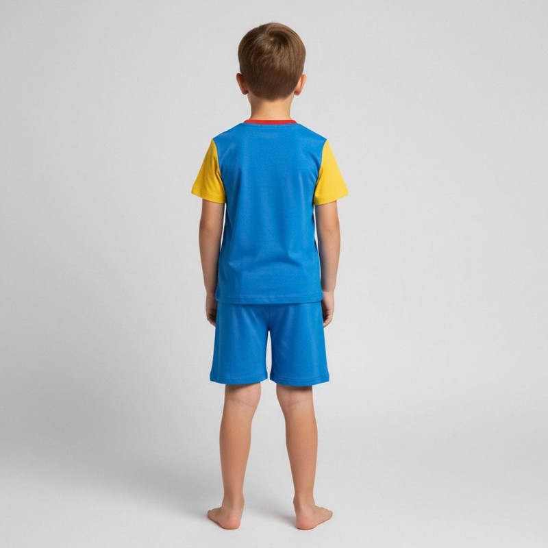 Découvrez le pyjama court Toy Story, idéal pour les jeunes fans de Woody. Cet ensemble comprend un t-shirt à manches courtes qui imite le gilet et la ceinture du célèbre shérif, accompagné d'un short bleu avec le logo Disney Pixar Toy Story. Fabriqué en 100% coton, il garantit confort et douceur pour le sommeil des enfants.