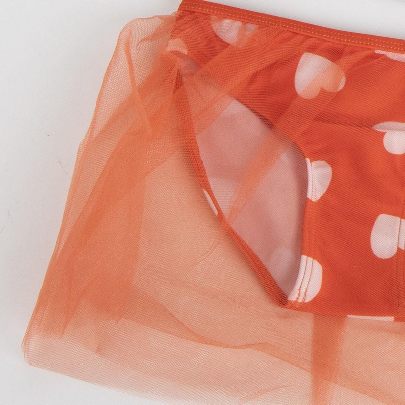 Ce bikini Minnie est spécialement conçu pour les jeunes fans du personnage emblématique de Disney. Fabriqué dans une couleur orange vive, l'ensemble présente un motif ludique de cœurs blancs pour une touche mignonne et amusante. Le haut est doté de larges bretelles, assurant un ajustement confortable et sécurisé, tandis que le bas comprend une jupe en maille pour un style supplémentaire.